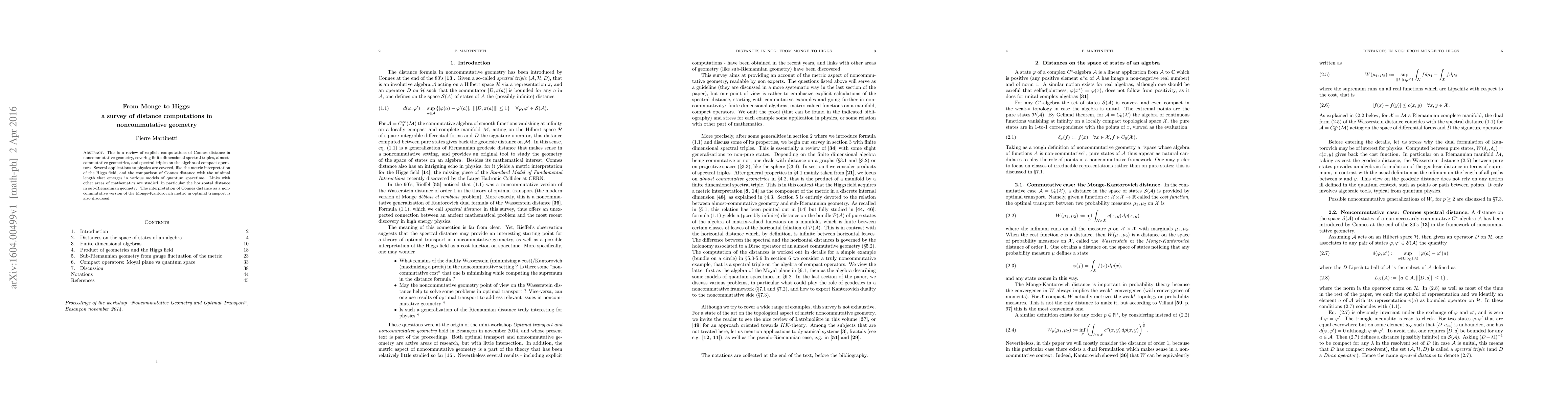 This paper reviews explicit computations of Connes distance in noncommutative geometry, focusing on spectral triples and their applications to physics, including the metric interpretation of the Higgs field. It also explores links with sub-Riemannian geometry and the Monge-Kantorovich metric in optimal transport.
