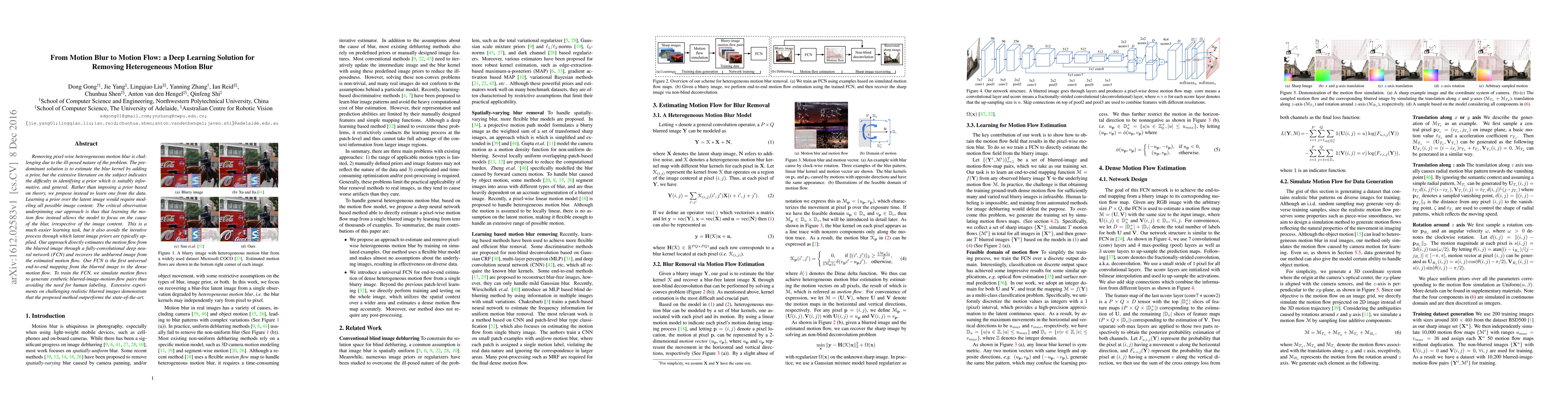 This paper proposes a deep learning solution to remove heterogeneous motion blur by estimating motion flow directly from blurred images using a fully-convolutional neural network (FCN). The method avoids the need for a prior by learning from synthetic data, demonstrating superior performance compared to existing techniques.