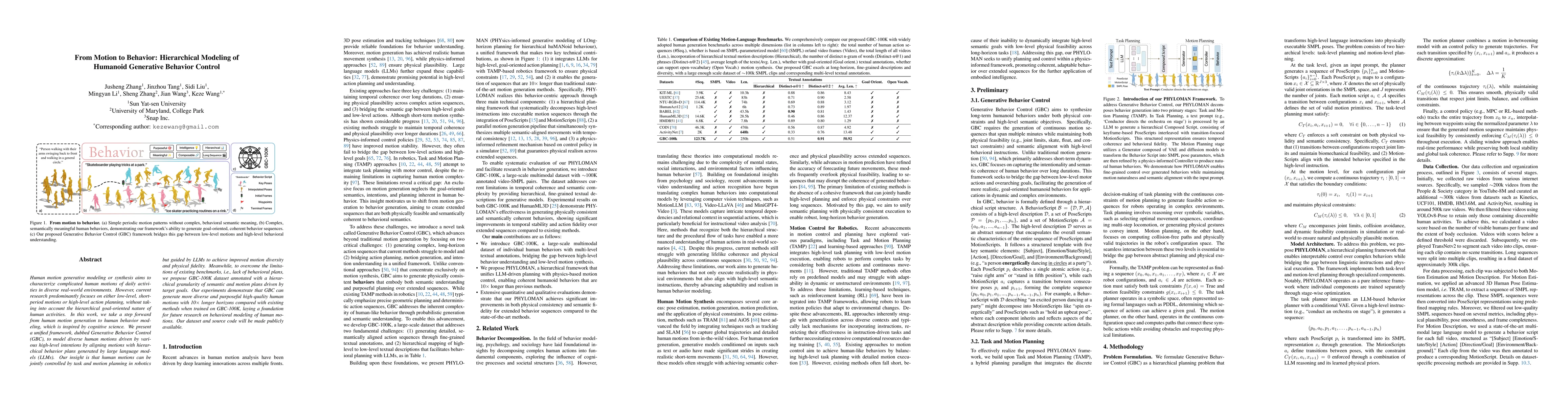 The research presents Generative Behavior Control (GBC), a unified framework for modeling diverse human motions driven by high-level intentions, aligning motions with hierarchical behavior plans generated by large language models (LLMs). It introduces the GBC-100K dataset, annotated with a hierarchical granularity of semantic and motion plans driven by target goals.