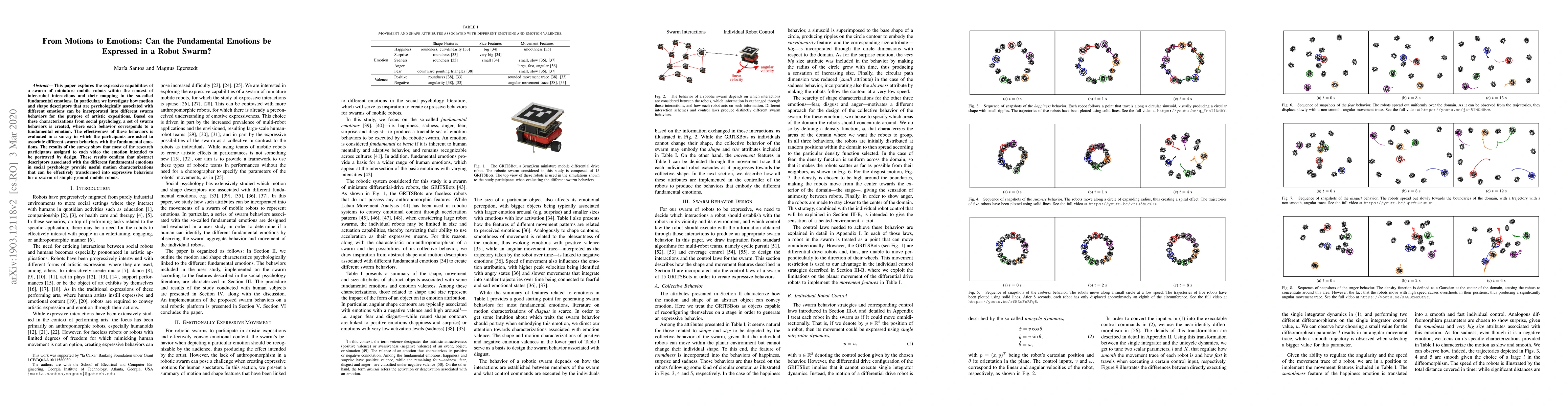 This paper explores the expressive capabilities of a swarm of miniature mobile robots within the context of inter-robot interactions and their mapping to the so-called fundamental emotions. In particular, we investigate how motion and shape descriptors that are psychologically associated with different emotions can be incorporated into different swarm behaviors for the purpose of artistic expositions. Based on these characterizations from social psychology, a set of swarm behaviors is created, where each behavior corresponds to a fundamental emotion. The effectiveness of these behaviors is evaluated in a survey in which the participants are asked to associate different swarm behaviors with the fundamental emotions. The results of the survey show that most of the research participants assigned to each video the emotion intended to be portrayed by design. These results confirm that abstract descriptors associated with the different fundamental emotions in social psychology provide useful motion characterizations that can be effectively transformed into expressive behaviors for a swarm of simple ground mobile robots.