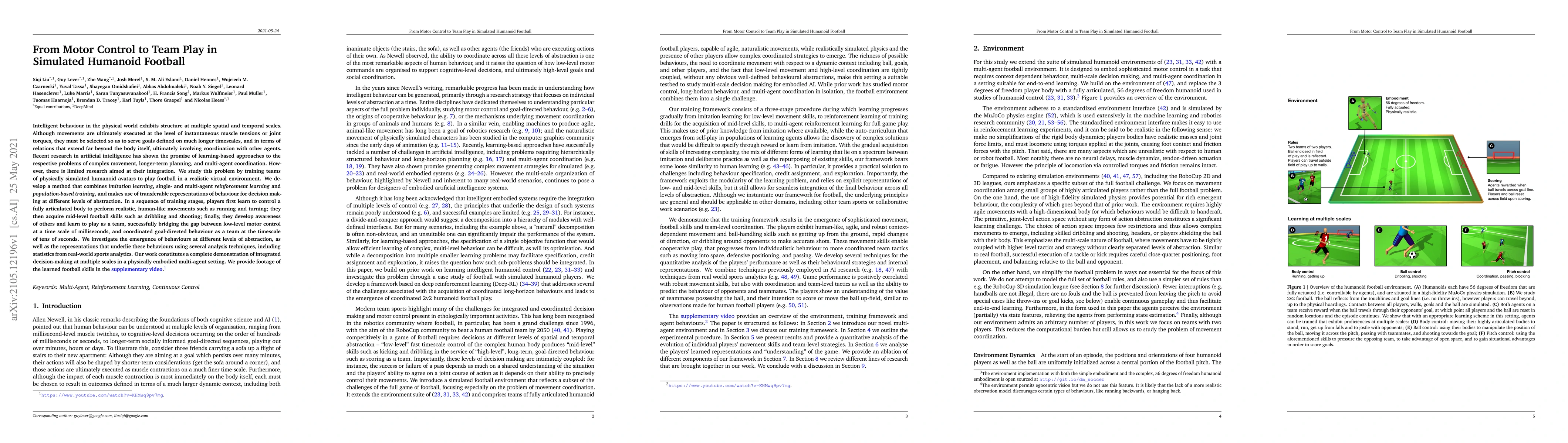 Intelligent behaviour in the physical world exhibits structure at multiple spatial and temporal scales. Although movements are ultimately executed at the level of instantaneous muscle tensions or joint torques, they must be selected to serve goals defined on much longer timescales, and in terms of relations that extend far beyond the body itself, ultimately involving coordination with other agents. Recent research in artificial intelligence has shown the promise of learning-based approaches to the respective problems of complex movement, longer-term planning and multi-agent coordination. However, there is limited research aimed at their integration. We study this problem by training teams of physically simulated humanoid avatars to play football in a realistic virtual environment. We develop a method that combines imitation learning, single- and multi-agent reinforcement learning and population-based training, and makes use of transferable representations of behaviour for decision making at different levels of abstraction. In a sequence of stages, players first learn to control a fully articulated body to perform realistic, human-like movements such as running and turning; they then acquire mid-level football skills such as dribbling and shooting; finally, they develop awareness of others and play as a team, bridging the gap between low-level motor control at a timescale of milliseconds, and coordinated goal-directed behaviour as a team at the timescale of tens of seconds. We investigate the emergence of behaviours at different levels of abstraction, as well as the representations that underlie these behaviours using several analysis techniques, including statistics from real-world sports analytics. Our work constitutes a complete demonstration of integrated decision-making at multiple scales in a physically embodied multi-agent setting. See project video at https://youtu.be/KHMwq9pv7mg.