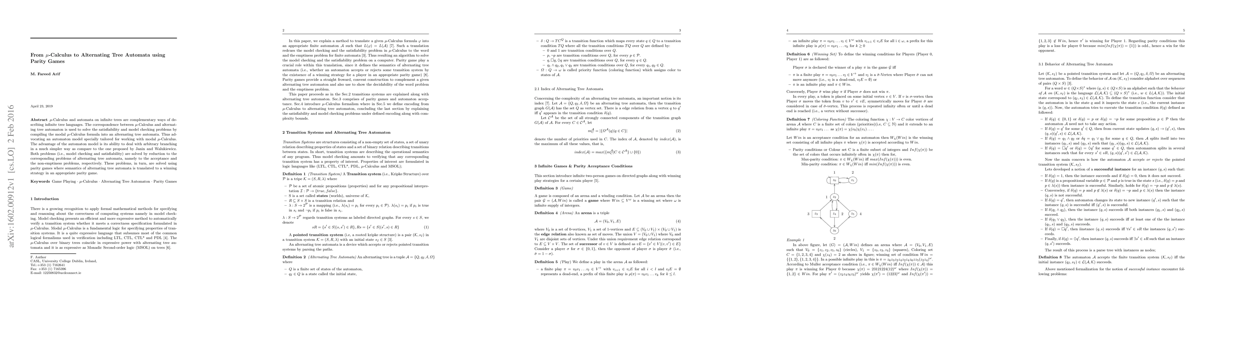 This paper explores the translation of $\mu$-Calculus formulas into alternating tree automata to tackle satisfiability and model checking problems. It utilizes parity games to simplify the handling of arbitrary branching, demonstrating improved efficiency over existing methods.