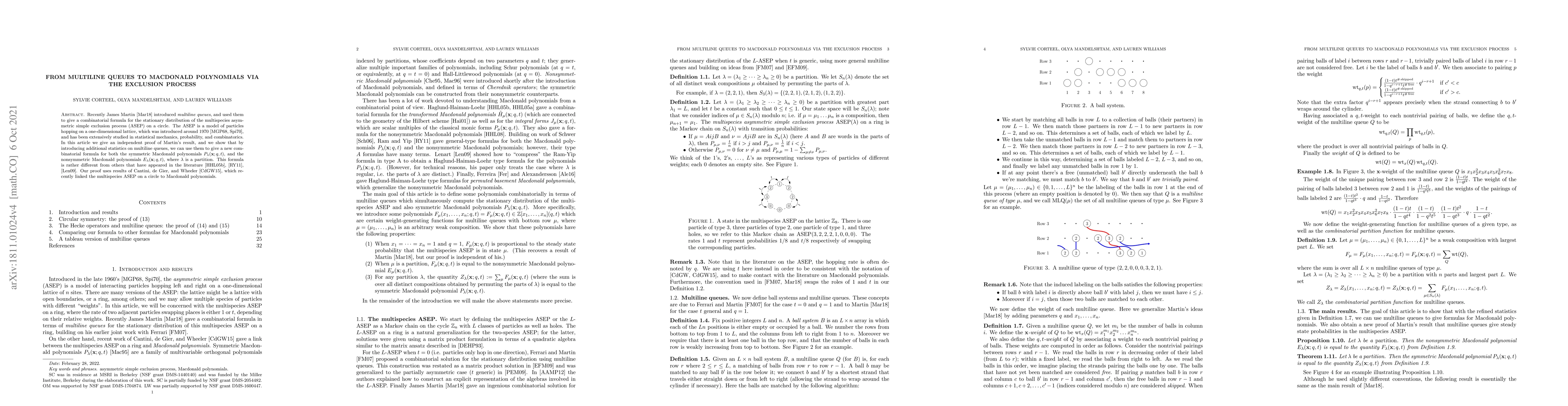This paper provides an independent proof of James Martin's combinatorial formula for the stationary distribution of the multispecies ASEP on a circle using multiline queues. It further demonstrates a novel connection between multiline queues and Macdonald polynomials, offering a distinct combinatorial formula for both symmetric and nonsymmetric Macdonald polynomials.
