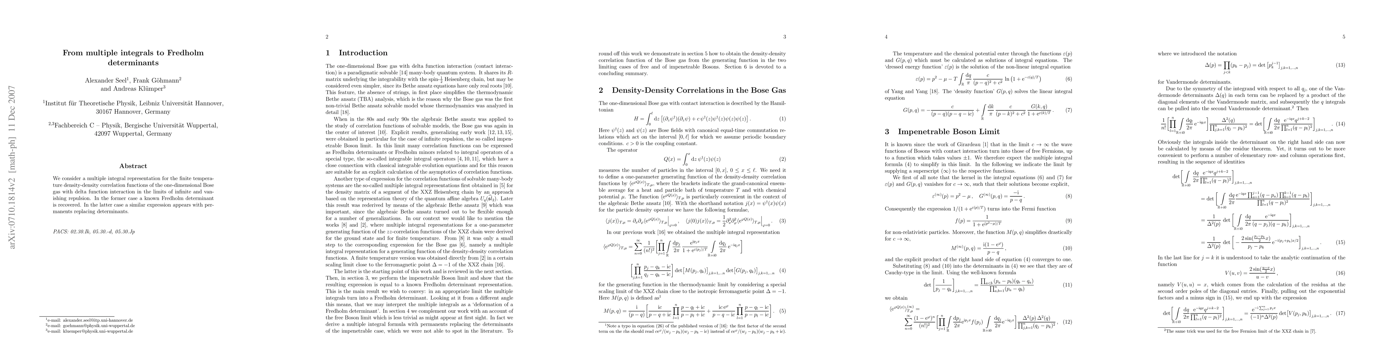 We consider a multiple integral representation for the finite temperature density-density correlation functions of the one-dimensional Bose gas with delta function interaction in the limits of infinite and vanishing repulsion. In the former case a known Fredholm determinant is recovered. In the latter case a similar expression appears with permanents replacing determinants.
