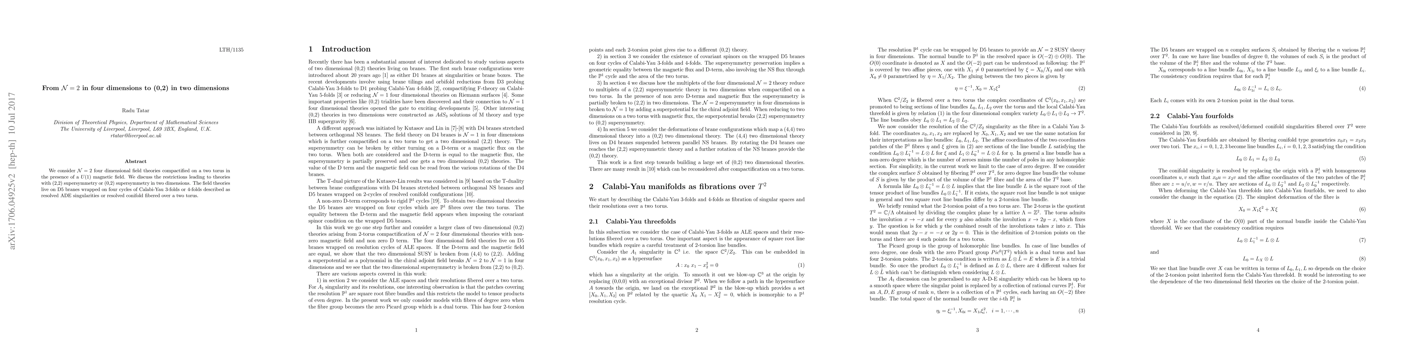 This paper explores the compactification of N=2 four-dimensional field theories on a two-torus under a U(1) magnetic field, leading to theories with either (2,2) or (0,2) supersymmetry in two dimensions, situated on D5 branes over resolved ADE singularities or conifold structures.