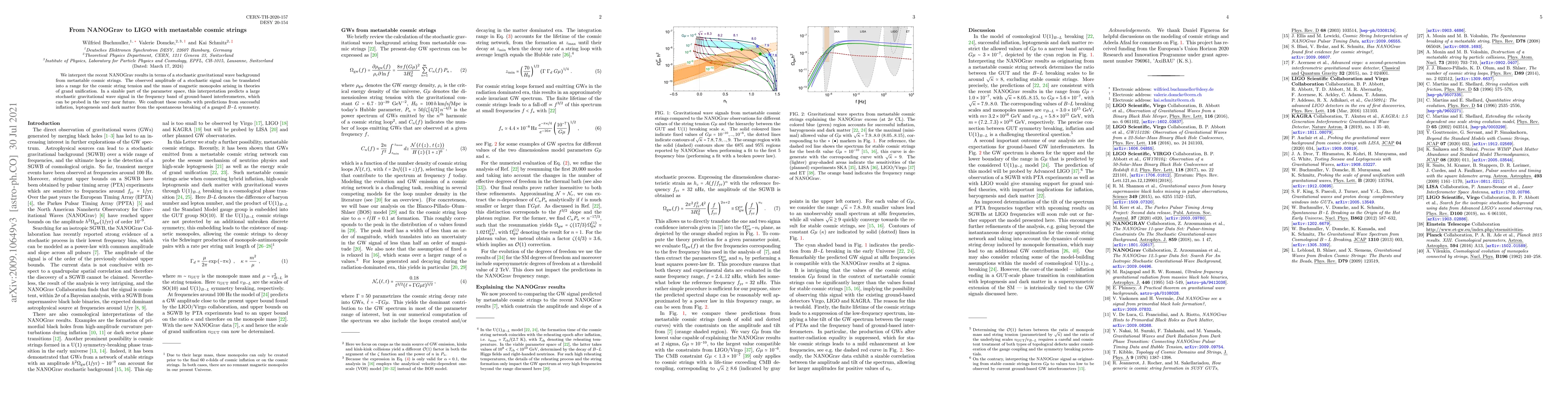 The paper interprets NANOGrav's gravitational wave results as indicative of a stochastic background from metastable cosmic strings, estimating cosmic string tension and monopole mass implications. Future LIGO detections in relevant frequency bands could validate this model, aligning with predictions for inflation, leptogenesis, and dark matter from B-L symmetry breaking.