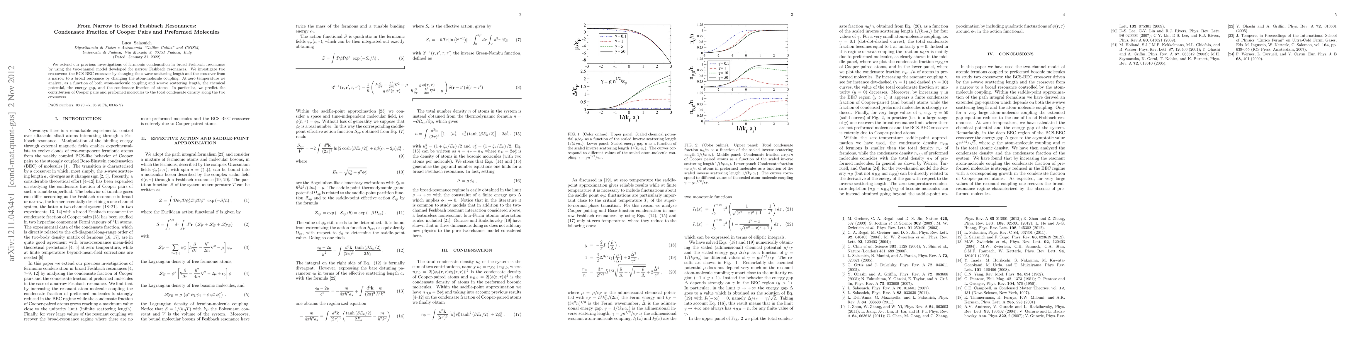 This paper explores the transition from narrow to broad Feshbach resonances in fermionic systems, using a two-channel model to analyze the BCS-BEC crossover and the shift from narrow to broad resonance. It predicts the condensate fraction of Cooper pairs and preformed molecules as functions of atom-molecule coupling and s-wave scattering length at zero temperature.