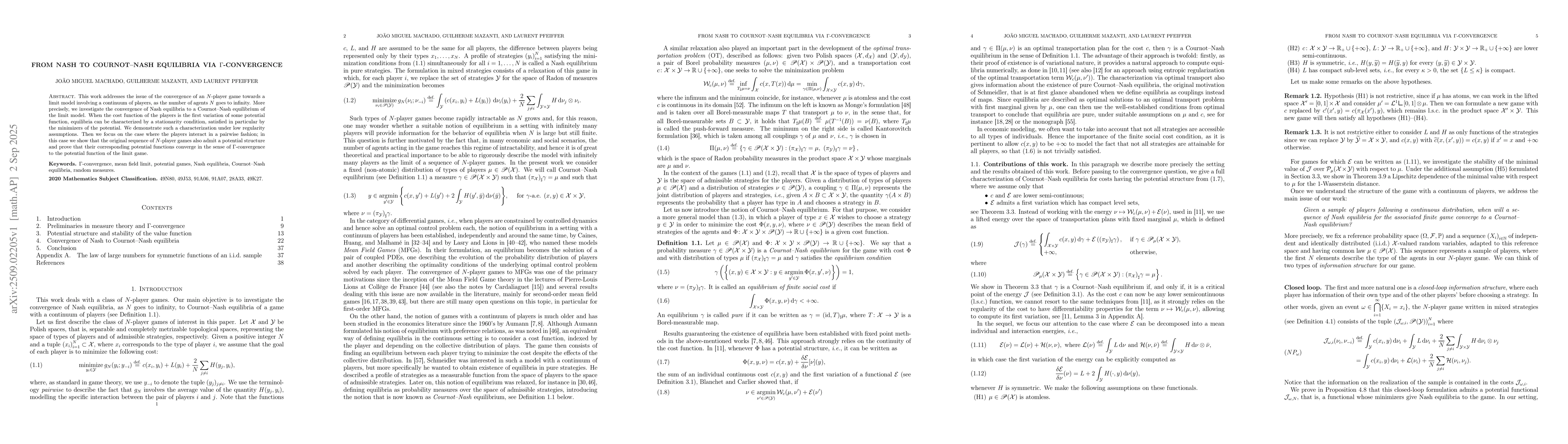 This work addresses the issue of the convergence of an $N$-player game towards a limit model involving a continuum of players, as the number of agents $N$ goes to infinity. More precisely, we investigate the convergence of Nash equilibria to a Cournot--Nash equilibrium of the limit model. When the cost function of the players is the first variation of some potential function, equilibria can be characterized by a stationarity condition, satisfied in particular by the minimizers of the potential. We demonstrate such a characterization under low regularity assumptions. Then we focus on the case where the players interact in a pairwise fashion; in this case we show that the original sequence of $N$-player games also admit a potential structure and prove that their corresponding potential functions converge in the sense of $\Gamma$-convergence to the potential function of the limit game.