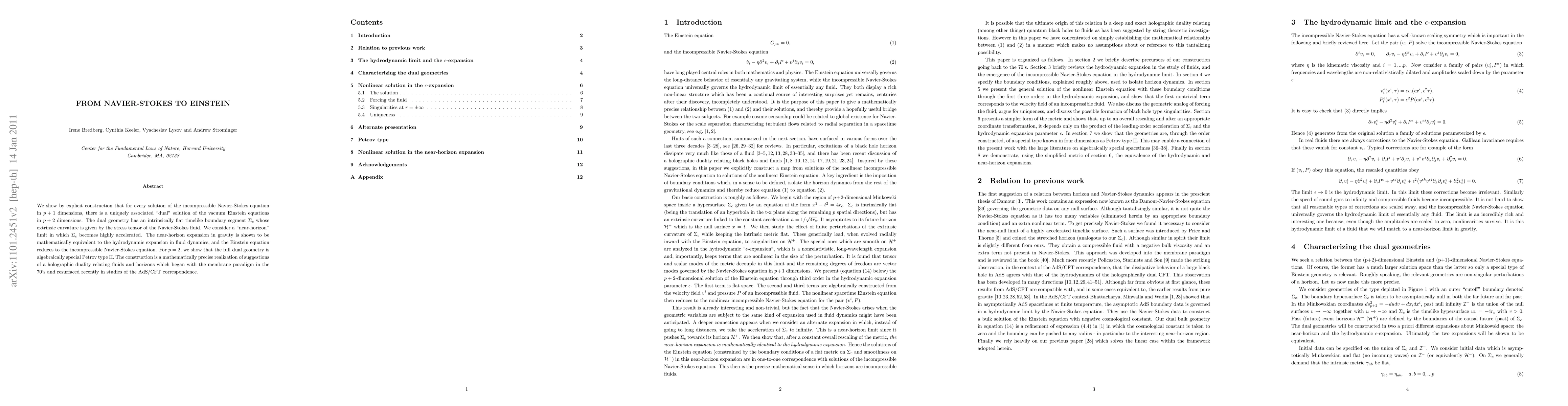 This paper constructs a dual relationship between solutions of the incompressible Navier-Stokes equation and the vacuum Einstein equations, demonstrating a holographic duality where fluid dynamics near a horizon mirrors gravitational dynamics. The dual geometry exhibits an intrinsically flat boundary whose curvature corresponds to the fluid's stress tensor.