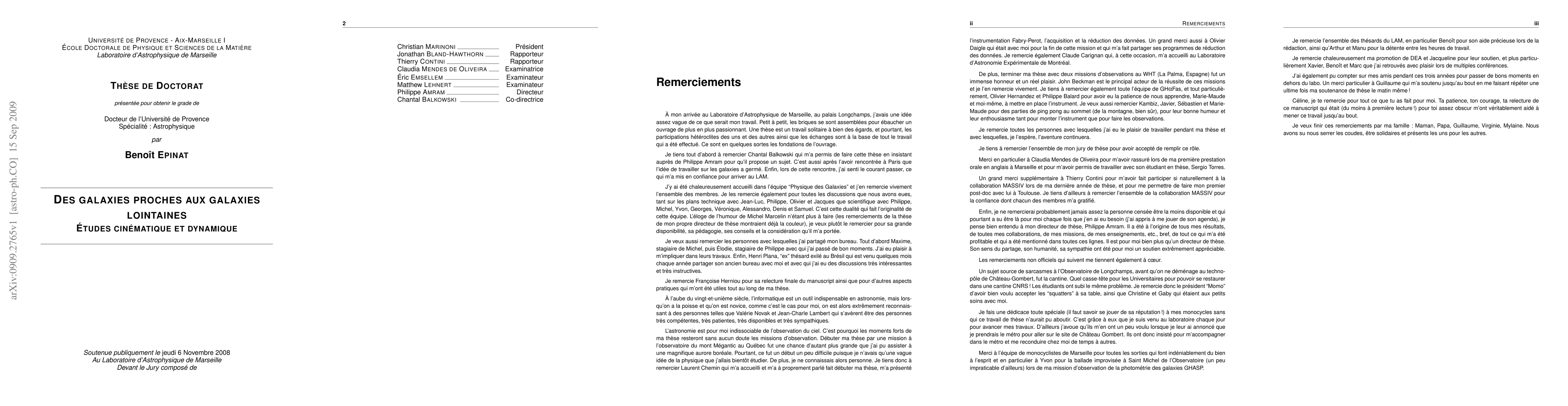 Kinematical studies of low and high redshift galaxies enables to probe galaxy formation and evolution scenarios. Integral field spectroscopy is a powerful tool to study with accuracy nearby galaxies kinematics. Recent observations also gives a new 2D vision of high redshift galaxies kinematics. This work mostly relies on the kinematical sample of galaxies GHASP. This control sample, composed of 203 local spiral and irregular galaxies in low density environments observed with Fabry-Perot techniques in the Ha line (6563 A), is by now the largest sample of Fabry-Perot data. After a revue on Fabry-Perot interferometry and a presentation of new data reduction procedures, my implications on both 3D-NTT Fabry-Perot instrument and the wide field spectrograph project (WFSpec) for galaxy evolution study with the european ELT are developed. The second section is dedicated to GHASP data. This sample have been fully reduced and analysed using new methods. The kinematical analysis of 2D kinematical maps has been undertaken with the study of the dark matter distribution, the rotation curves shape, bar signatures and the ionized gas velocity dispersion. In a third section, this local reference sample is used as a zero point for high redshift galaxies kinematical studies. The GHASP sample is projected at high redshift (z=1.7) in order to disentangle evolution effects from distance biases in high redshift galaxies kinematical data observed with SINFONI, OSIRIS and GIRAFFE. The kinematical analysis of new SINFONI high redshift observations is also presented and high redshift data found in the literature are compared with GHASP projected sample, suggesting some evolution of the galaxy dynamical support within the ages.