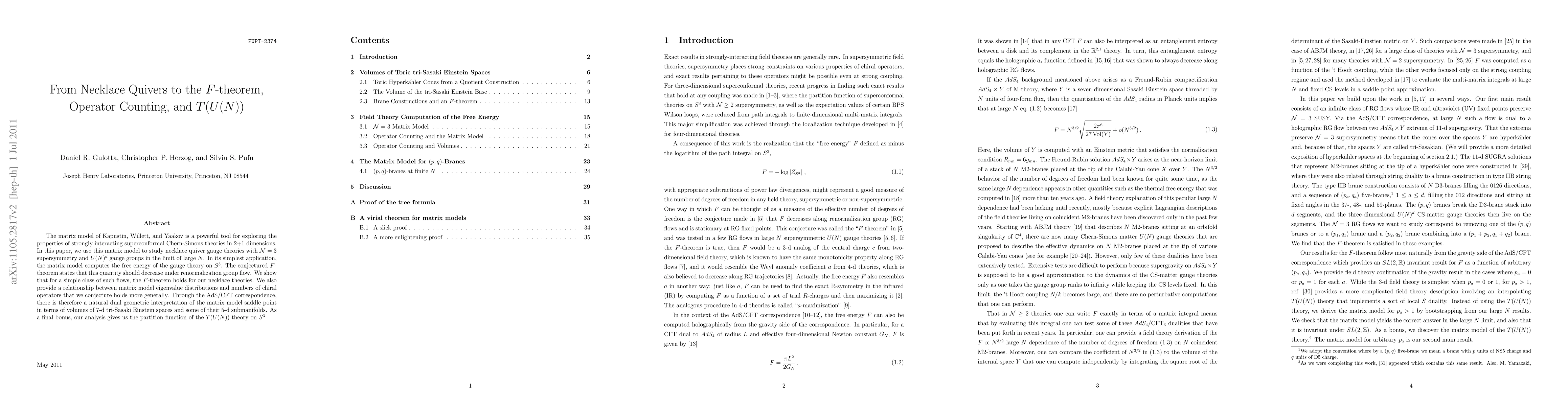 Researchers used a matrix model to study necklace quiver gauge theories with 3 supersymmetry in 2+1 dimensions, finding that the F-theorem holds for certain flows and providing insights into operator counting and T(U(N)) theory.