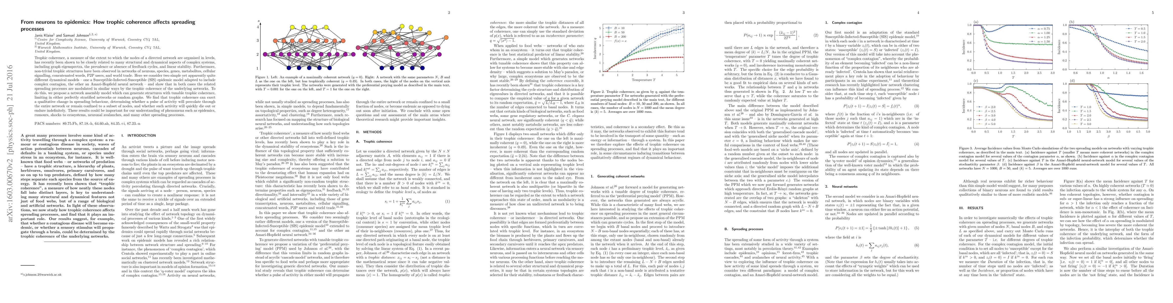 This paper investigates how trophic coherence—the organization of network nodes into levels—affects spreading processes in both epidemic models and neural networks. The study finds that trophic coherence can significantly modulate the dynamics of spreading, determining whether activity remains localized or spreads globally, and whether it persists or dies out.