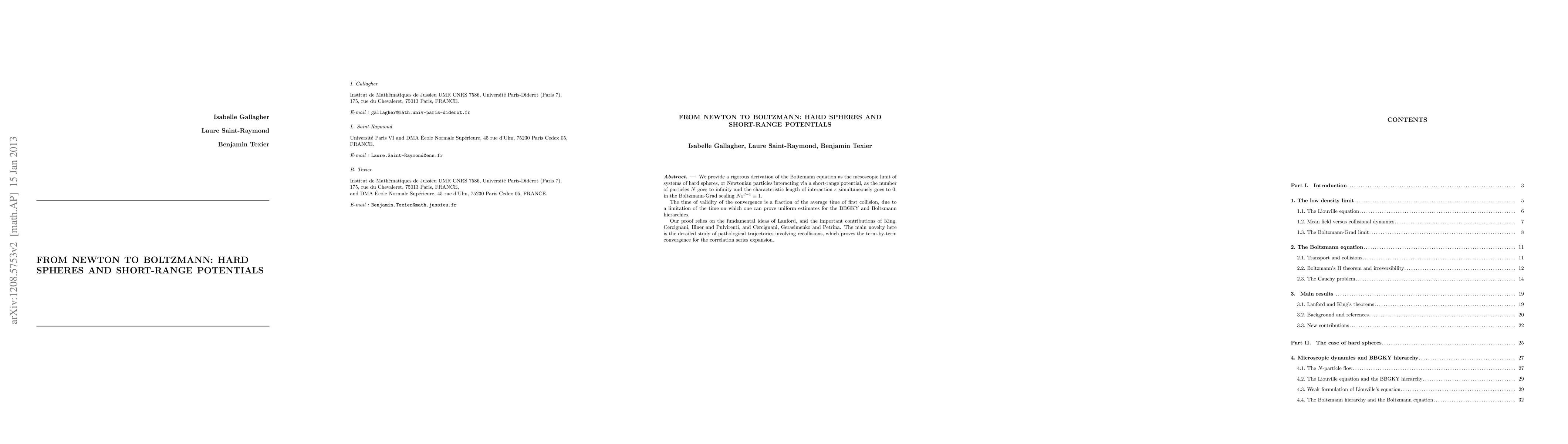 This paper rigorously derives the Boltzmann equation from systems of hard spheres or Newtonian particles with short-range interactions, showing convergence as the number of particles increases and interaction length decreases. The proof addresses the time validity of convergence and highlights the importance of studying recollisions for term-by-term convergence.