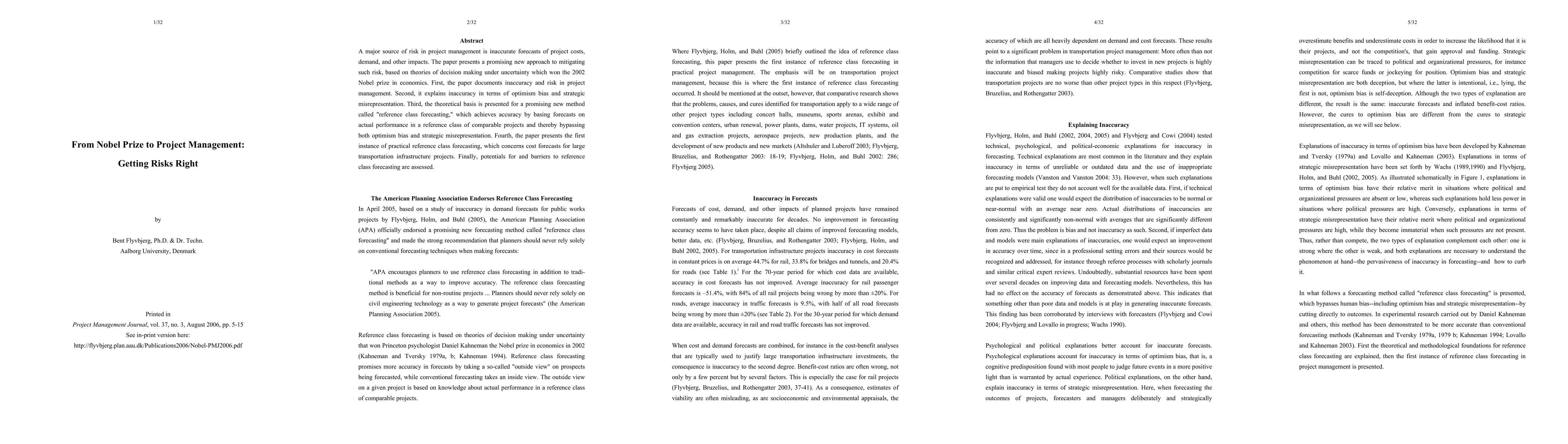 A major source of risk in project management is inaccurate forecasts of project costs, demand, and other impacts. The paper presents a promising new approach to mitigating such risk, based on theories of decision making under uncertainty which won the 2002 Nobel prize in economics. First, the paper documents inaccuracy and risk in project management. Second, it explains inaccuracy in terms of optimism bias and strategic misrepresentation. Third, the theoretical basis is presented for a promising new method called "reference class forecasting," which achieves accuracy by basing forecasts on actual performance in a reference class of comparable projects and thereby bypassing both optimism bias and strategic misrepresentation. Fourth, the paper presents the first instance of practical reference class forecasting, which concerns cost forecasts for large transportation infrastructure projects. Finally, potentials for and barriers to reference class forecasting are assessed.