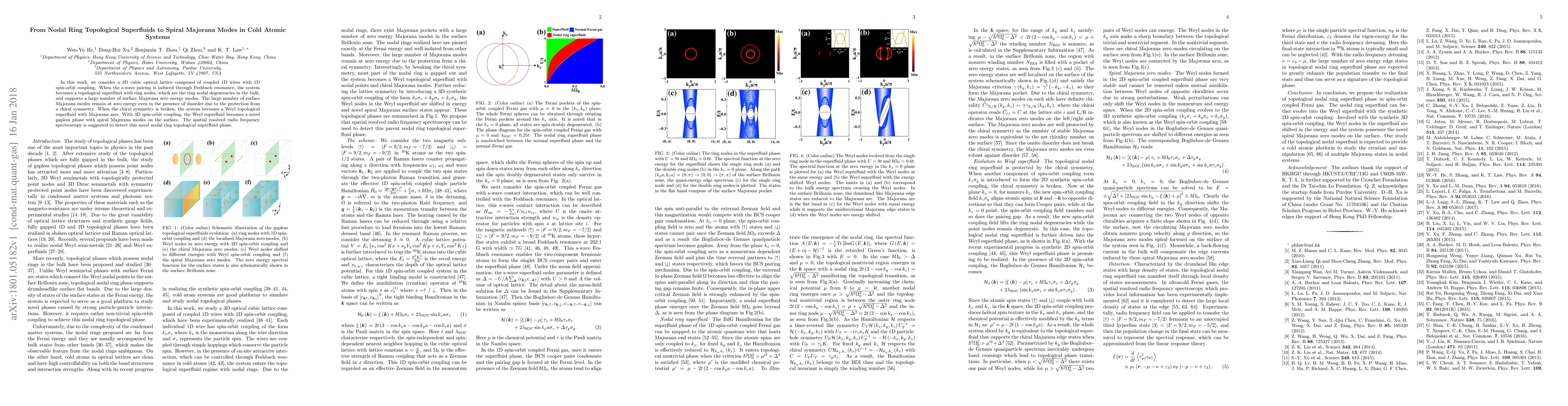 This paper explores a 3D cubic optical lattice with coupled 1D wires and spin-orbit coupling, revealing a topological superfluid phase with ring nodal degeneracies and surface Majorana modes. The study also investigates the transition to spiral Majorana modes under broken chiral symmetry and suggests radio frequency spectroscopy as a detection method.