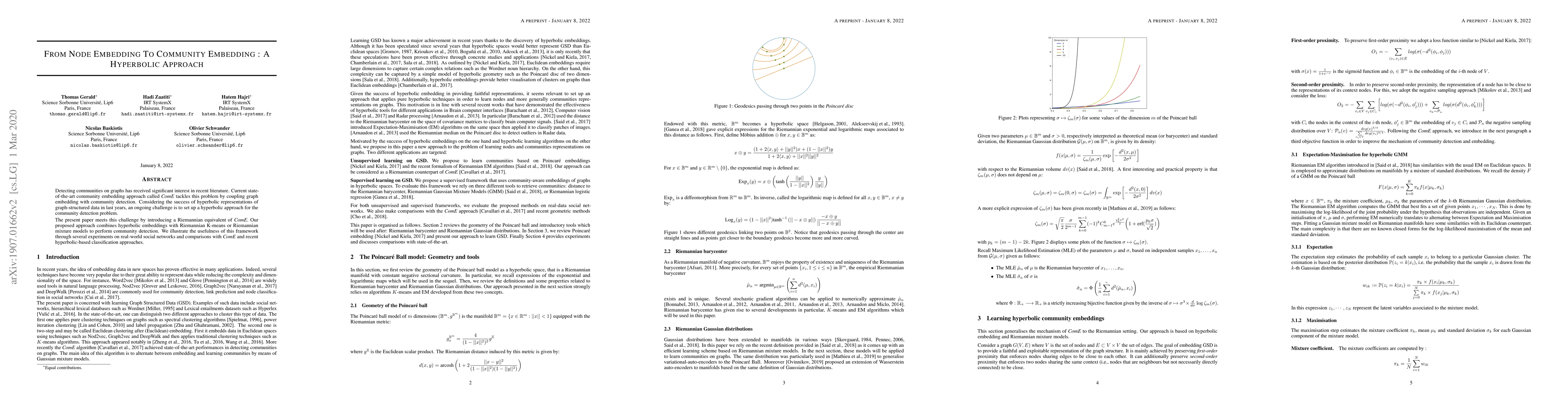 This paper introduces a hyperbolic approach for community detection by combining hyperbolic embeddings with Riemannian K-means or mixture models, aiming to improve upon existing graph embedding techniques. The proposed method is validated through experiments on real-world social networks, demonstrating its effectiveness compared to state-of-the-art methods.
