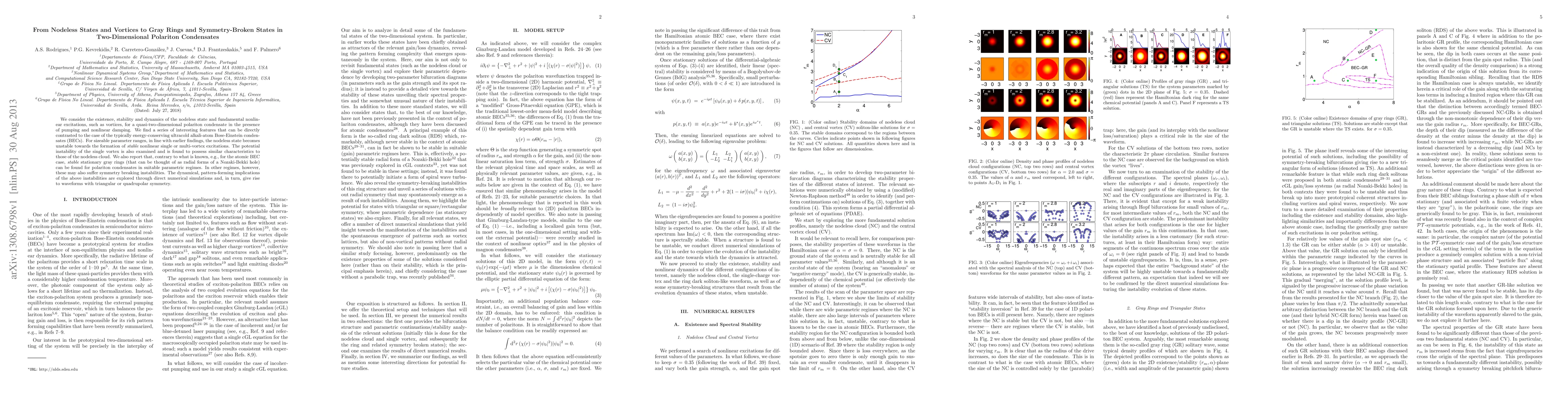 We consider the existence, stability and dynamics of the nodeless state and fundamental nonlinear excitations, such as vortices, for a quasi-two-dimensional polariton condensate in the presence of pumping and nonlinear damping. We find a series of interesting features that can be directly contrastedto the case of the typically energy-conserving ultracold alkali-atom Bose-Einstein condensates (BECs). For sizeable parameter ranges, in line with earlier findings, the nodeless state becomes unstable towards the formation of {\em stable} nonlinear single or multi-vortex excitations. The potential instability of the single vortex is also examined and is found to possess similar characteristics to those of the nodeless cloud. We also report that, contrary to what is known, e.g., for the atomic BEC case, {\it stable} stationary gray rings (that can be thought of as radial forms of a Nozaki-Bekki hole) can be found for polariton condensates in suitable parametric regimes. In other regimes, however, these may also suffer symmetry breaking instabilities. The dynamical, pattern-forming implications of the above instabilities are explored through direct numerical simulations and, in turn, give rise to waveforms with triangular or quadrupolar symmetry.