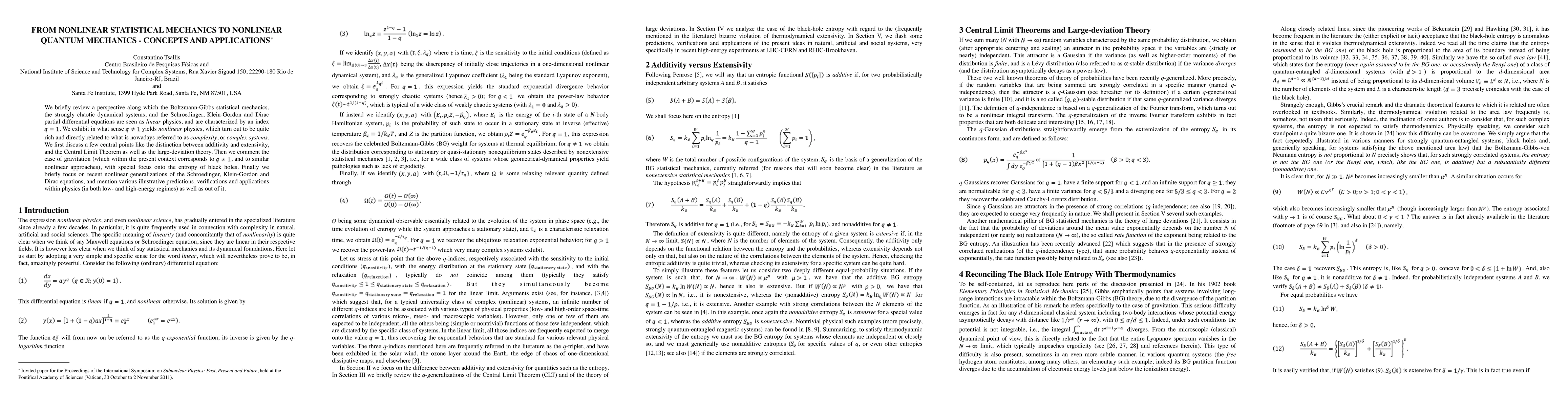 We briefly review a perspective along which the Boltzmann-Gibbs statistical mechanics, the strongly chaotic dynamical systems, and the Schroedinger, Klein-Gordon and Dirac partial differential equations are seen as linear physics, and are characterized by an index q = 1. We exhibit in what sense q {\neq} 1 yields nonlinear physics, which turn out to be quite rich and directly related to what is nowadays referred to as complexity, or complex systems. We first discuss a few central points like the distinction between additivity and extensivity, and the Central Limit Theorem as well as the large-deviation theory. Then we comment the case of gravitation (which within the present context corresponds to q {\neq} 1, and to similar nonlinear approaches), with special focus onto the entropy of black holes. Finally we briefly focus on recent nonlinear generalizations of the Schroedinger, Klein-Gordon and Dirac equations, and mention various illustrative predictions, verifications and applications within physics (in both low- and high-energy regimes) as well as out of it.