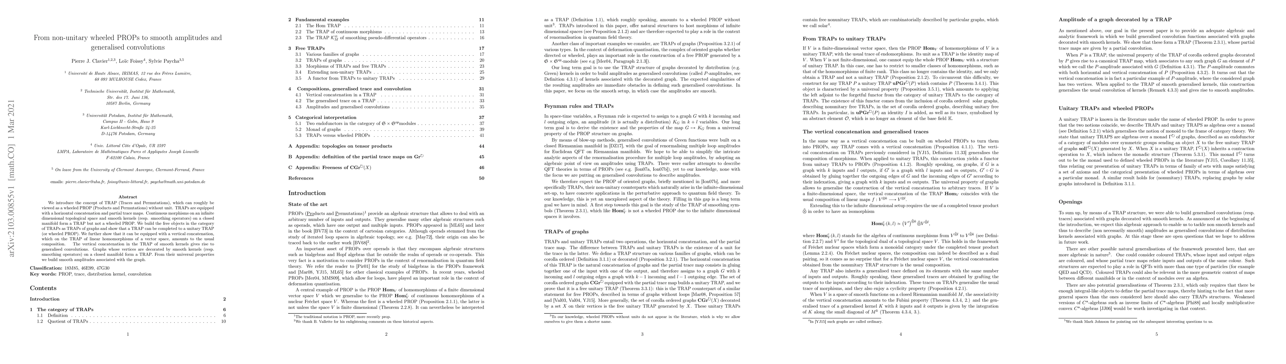 We introduce the concept of TRAP (Traces and Permutations), which can roughly be viewed as a wheeled PROP (Products and Permutations) without unit. TRAPs are equipped with a horizontal concatenation and partial trace maps. Continuous morphisms on an infinite dimensional topological space and smooth kernels (resp. smoothing operators) on a closed manifold form a TRAP but not a wheeled PROP. We build the free objects in the category of TRAPs as TRAPs of graphs and show that a TRAP can be completed to a unitary TRAP (or wheeled PROP). We further show that it can be equipped with a vertical concatenation, which on the TRAP of linear homomorphisms of a vector space, amounts to the usual composition. The vertical concatenation in the TRAP of smooth kernels gives rise to generalised convolutions. Graphs whose vertices are decorated by smooth kernels (resp. smoothing operators) on a closed manifold form a TRAP. From their universal properties we build smooth amplitudes associated with the graph.