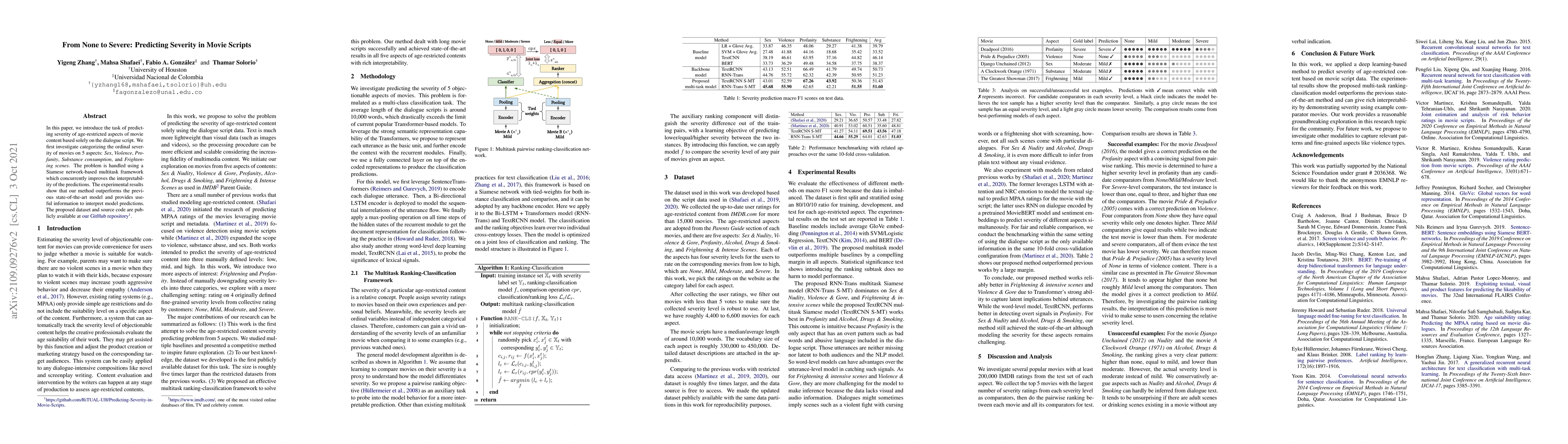 In this paper, we introduce the task of predicting severity of age-restricted aspects of movie content based solely on the dialogue script. We first investigate categorizing the ordinal severity of movies on 5 aspects: Sex, Violence, Profanity, Substance consumption, and Frightening scenes. The problem is handled using a siamese network-based multitask framework which concurrently improves the interpretability of the predictions. The experimental results show that our method outperforms the previous state-of-the-art model and provides useful information to interpret model predictions. The proposed dataset and source code are publicly available at our GitHub repository.