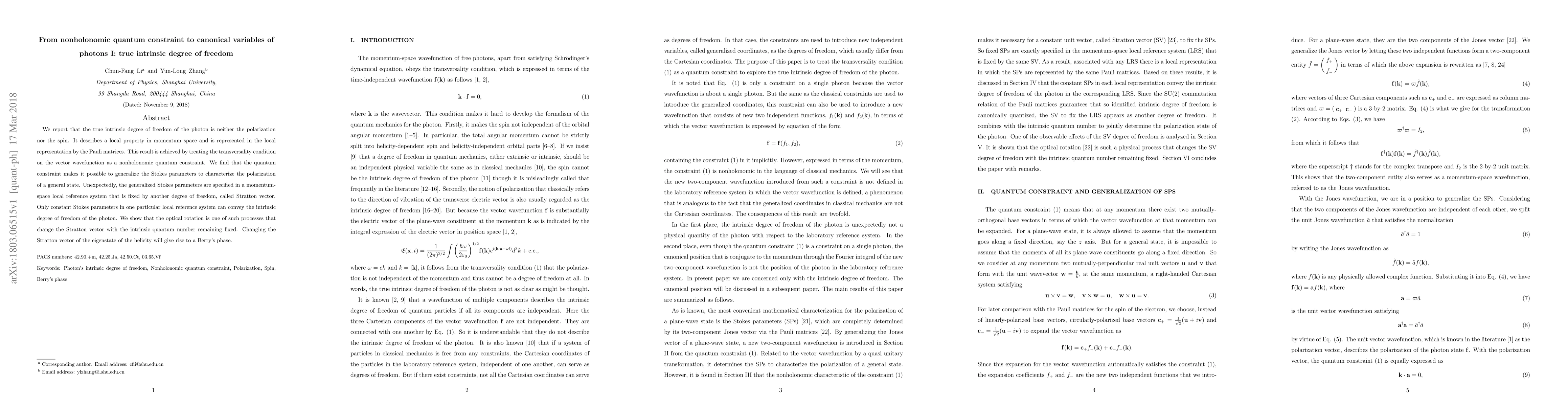 We report that the true intrinsic degree of freedom of the photon is neither the polarization nor the spin. It describes a local property in momentum space and is represented in the local representation by the Pauli matrices. This result is achieved by treating the transversality condition on the vector wavefunction as a nonholonomic quantum constraint. We find that the quantum constraint makes it possible to generalize the Stokes parameters to characterize the polarization of a general state. Unexpectedly, the generalized Stokes parameters are specified in a momentum-space local reference system that is fixed by another degree of freedom, called Stratton vector. Only constant Stokes parameters in one particular local reference system can convey the intrinsic degree of freedom of the photon. We show that the optical rotation is one of such processes that change the Stratton vector with the intrinsic quantum number remaining fixed. Changing the Stratton vector of the eigenstate of the helicity will give rise to a Berry's phase.