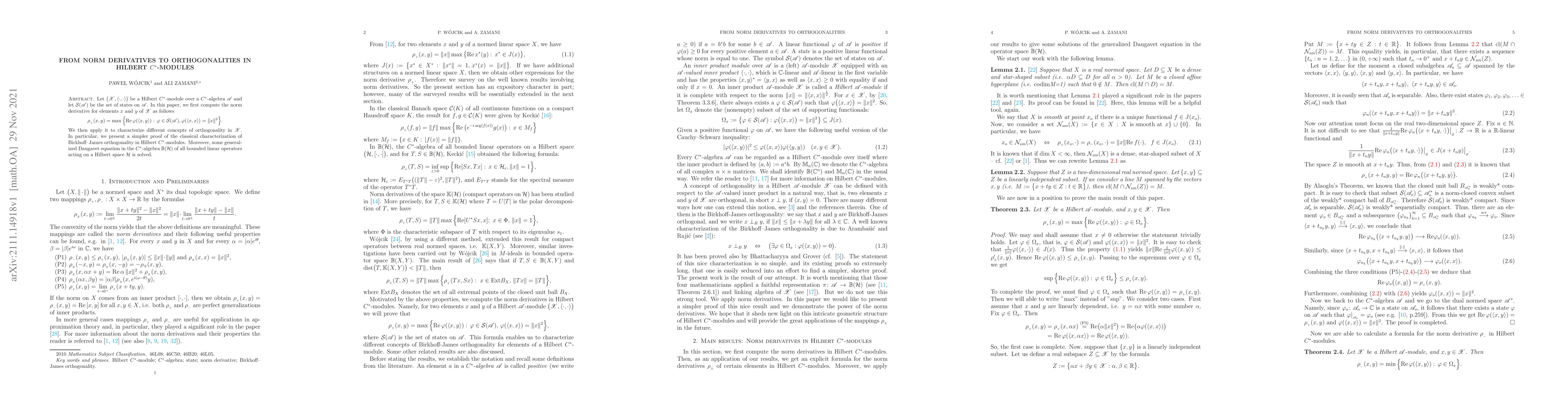 Let $\big(\mathscr{X}, \langle\cdot, \cdot\rangle\big)$ be a Hilbert $C^*$-module over a $C^*$-algebra $\mathscr{A}$ and let $\mathcal{S}(\mathscr{A})$ be the set of states on $\mathscr{A}$. In this paper, we first compute the norm derivative for elements $x$ and $y$ of $\mathscr{X}$ as follows \begin{align*} \rho_{_{+}}(x, y) = \max\Big\{\mbox{Re}\,\varphi(\langle x, y\rangle): \, \varphi \in \mathcal{S}(\mathscr{A}), \varphi(\langle x, x\rangle) = \|x\|^2\Big\}. \end{align*} We then apply it to characterize different concepts of orthogonality in $\mathscr{X}$. In particular, we present a simpler proof of the classical characterization of Birkhoff--James orthogonality in Hilbert $C^*$-modules. Moreover, some generalized Daugavet equation in the $C^*$-algebra $\mathbb{B}(\mathcal{H})$ of all bounded linear operators acting on a Hilbert space $\mathcal{H}$ is solved.