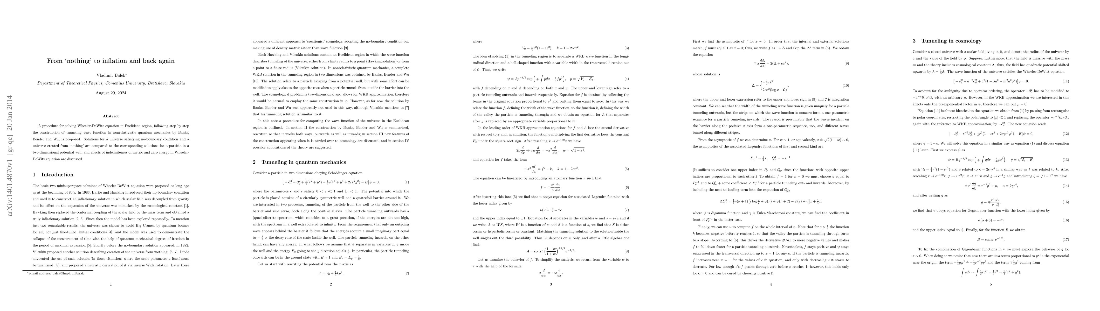 A procedure for solving Wheeler-DeWitt equation in Euclidean region, following step by step the construction of tunneling wave function in nonrelativistic quantum mechanics by Banks, Bender and Wu, is proposed. Solutions for a universe satisfying no-boundary condition and a universe created from 'nothing' are compared to the corresponding solutions for a particle in a two-dimensional potential well, and effects of indefiniteness of metric and zero energy in Wheeler-DeWitt equation are discussed.