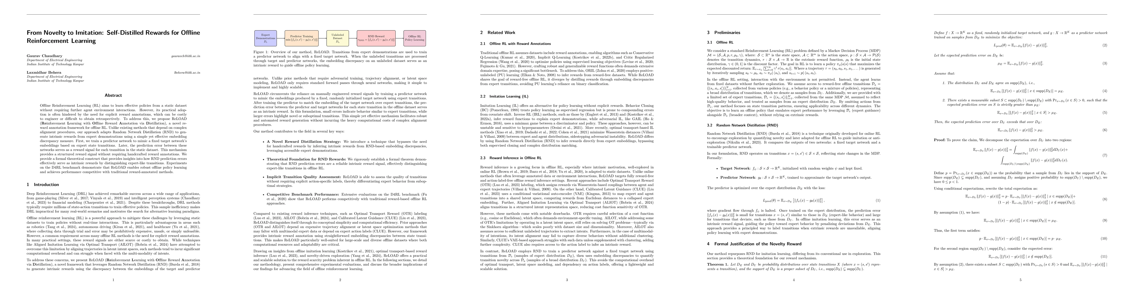 Offline Reinforcement Learning (RL) aims to learn effective policies from a static dataset without requiring further agent-environment interactions. However, its practical adoption is often hindered by the need for explicit reward annotations, which can be costly to engineer or difficult to obtain retrospectively. To address this, we propose ReLOAD (Reinforcement Learning with Offline Reward Annotation via Distillation), a novel reward annotation framework for offline RL. Unlike existing methods that depend on complex alignment procedures, our approach adapts Random Network Distillation (RND) to generate intrinsic rewards from expert demonstrations using a simple yet effective embedding discrepancy measure. First, we train a predictor network to mimic a fixed target network's embeddings based on expert state transitions. Later, the prediction error between these networks serves as a reward signal for each transition in the static dataset. This mechanism provides a structured reward signal without requiring handcrafted reward annotations. We provide a formal theoretical construct that offers insights into how RND prediction errors effectively serve as intrinsic rewards by distinguishing expert-like transitions. Experiments on the D4RL benchmark demonstrate that ReLOAD enables robust offline policy learning and achieves performance competitive with traditional reward-annotated methods.