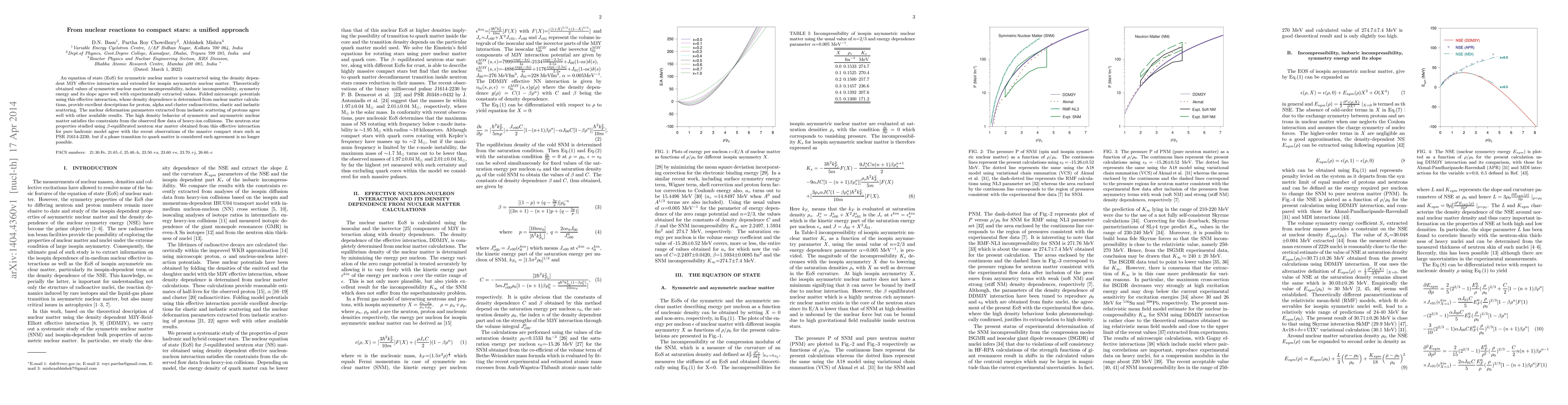 An equation of state (EoS) for symmetric nuclear matter is constructed using the density dependent M3Y effective interaction and extended for isospin asymmetric nuclear matter. Theoretically obtained values of symmetric nuclear matter incompressibility, isobaric incompressibility, symmetry energy and its slope agree well with experimentally extracted values. Folded microscopic potentials using this effective interaction, whose density dependence is determined from nuclear matter calculations, provide excellent descriptions for proton, alpha and cluster radioactivities, elastic and inelastic scattering. The nuclear deformation parameters extracted from inelastic scattering of protons agree well with other available results. The high density behavior of symmetric and asymmetric nuclear matter satisfies the constraints from the observed flow data of heavy-ion collisions. The neutron star properties studied using $\beta$-equilibrated neutron star matter obtained from this effective interaction for pure hadronic model agree with the recent observations of the massive compact stars such as PSR J1614-2230, but if a phase transition to quark matter is considered such agreement is no longer possible.