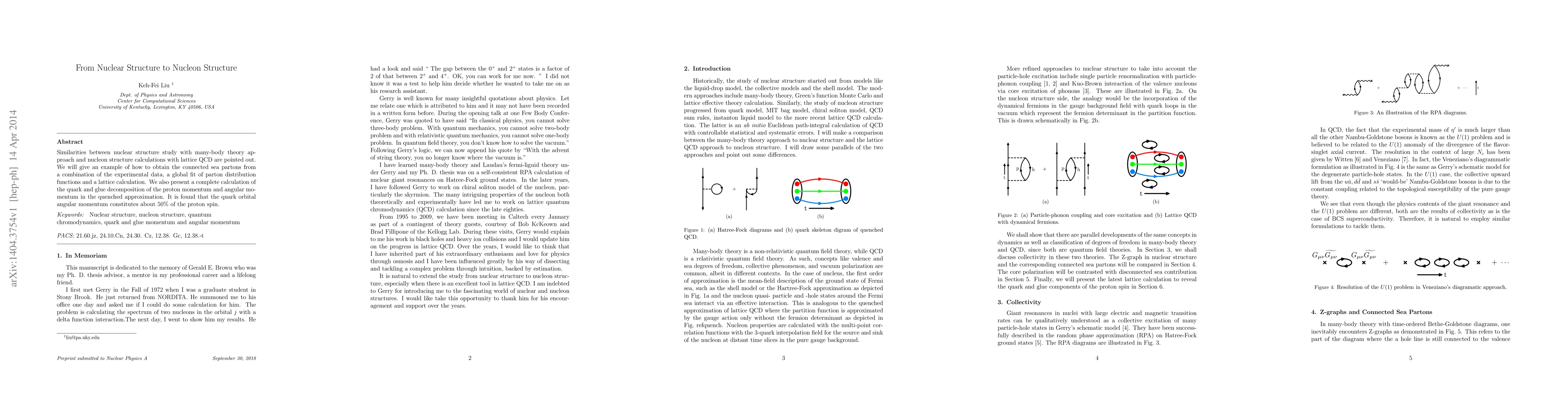 Similarities between nuclear structure study with many-body theory approach and nucleon structure calculations with lattice QCD are pointed out. We will give an example of how to obtain the connected sea partons from a combination of the experimental data, a global fit of parton distribution functions and a lattice calculation. We also present a complete calculation of the quark and glue decomposition of the proton momentum and angular momentum in the quenched approximation. It is found that the quark orbital angular momentum constitutes about 50% of the proton spin.
