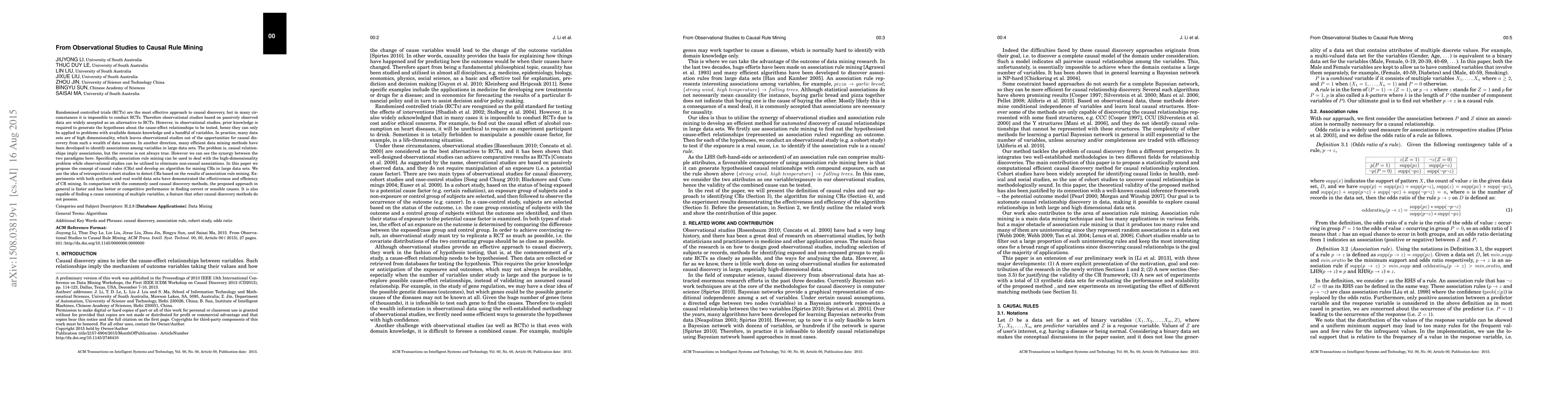 This paper proposes a novel method called causal rules (CRs) to discover causal relationships from high-dimensional observational data. By combining association rule mining with retrospective cohort studies, the method effectively identifies causal associations while eliminating non-causal ones, demonstrating faster performance and better accuracy compared to traditional causal discovery methods.
