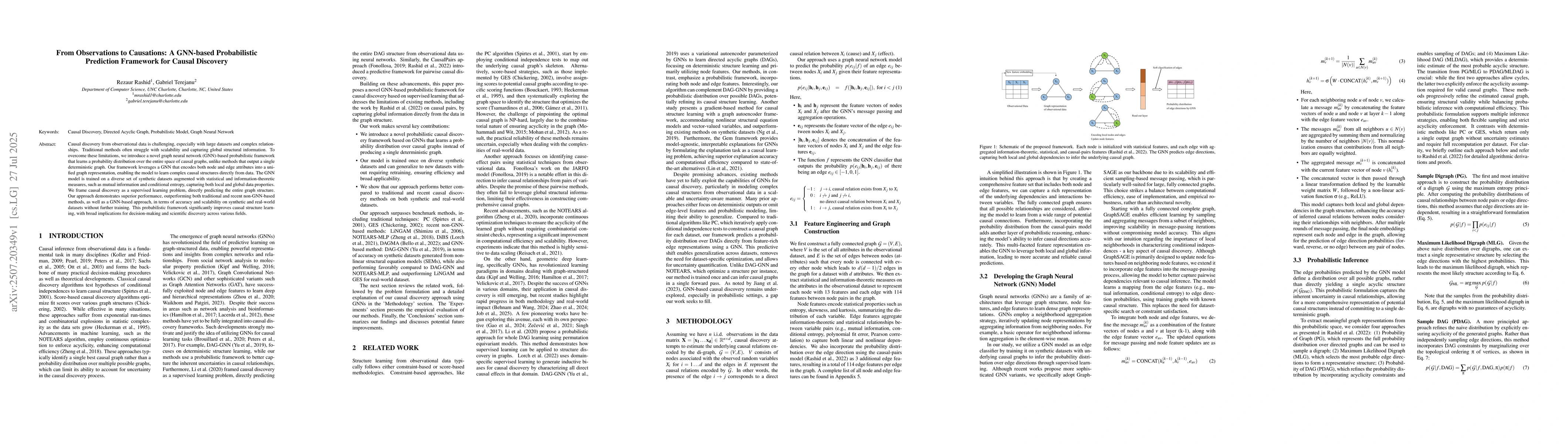Causal discovery from observational data is challenging, especially with large datasets and complex relationships. Traditional methods often struggle with scalability and capturing global structural information. To overcome these limitations, we introduce a novel graph neural network (GNN)-based probabilistic framework that learns a probability distribution over the entire space of causal graphs, unlike methods that output a single deterministic graph. Our framework leverages a GNN that encodes both node and edge attributes into a unified graph representation, enabling the model to learn complex causal structures directly from data. The GNN model is trained on a diverse set of synthetic datasets augmented with statistical and information-theoretic measures, such as mutual information and conditional entropy, capturing both local and global data properties. We frame causal discovery as a supervised learning problem, directly predicting the entire graph structure. Our approach demonstrates superior performance, outperforming both traditional and recent non-GNN-based methods, as well as a GNN-based approach, in terms of accuracy and scalability on synthetic and real-world datasets without further training. This probabilistic framework significantly improves causal structure learning, with broad implications for decision-making and scientific discovery across various fields.