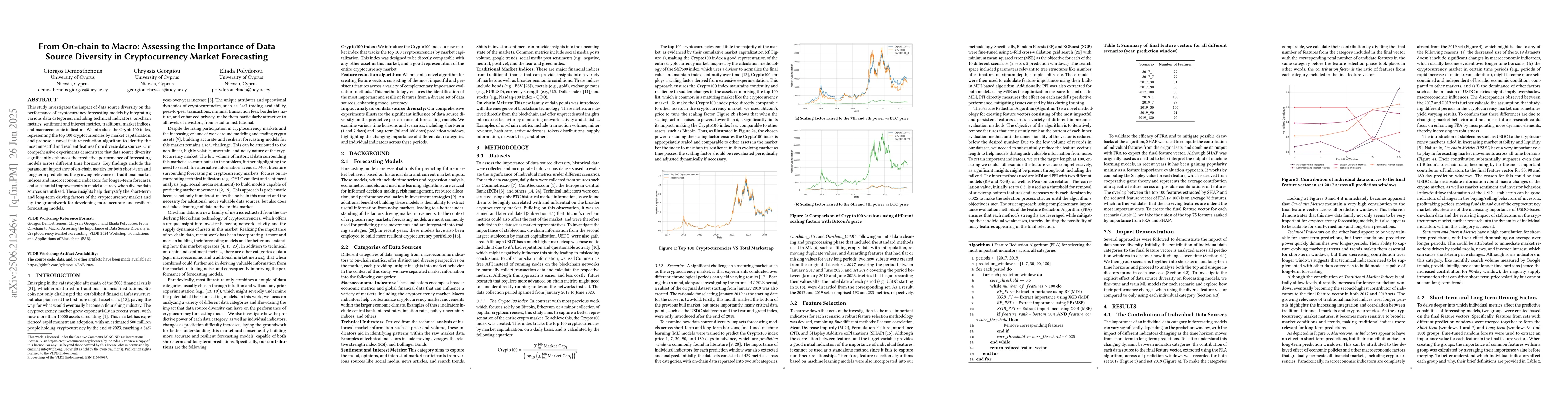 This study investigates the impact of data source diversity on the performance of cryptocurrency forecasting models by integrating various data categories, including technical indicators, on-chain metrics, sentiment and interest metrics, traditional market indices, and macroeconomic indicators. We introduce the Crypto100 index, representing the top 100 cryptocurrencies by market capitalization, and propose a novel feature reduction algorithm to identify the most impactful and resilient features from diverse data sources. Our comprehensive experiments demonstrate that data source diversity significantly enhances the predictive performance of forecasting models across different time horizons. Key findings include the paramount importance of on-chain metrics for both short-term and long-term predictions, the growing relevance of traditional market indices and macroeconomic indicators for longer-term forecasts, and substantial improvements in model accuracy when diverse data sources are utilized. These insights help demystify the short-term and long-term driving factors of the cryptocurrency market and lay the groundwork for developing more accurate and resilient forecasting models.