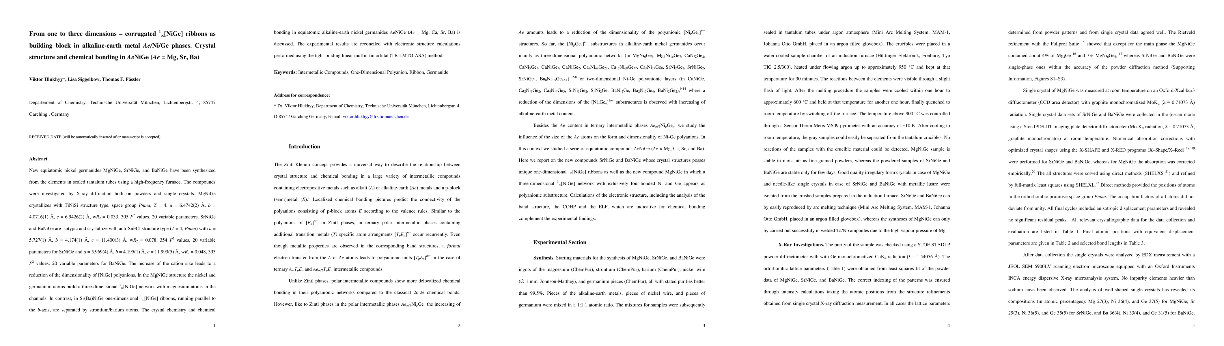 New equiatomic nickel germanides MgNiGe, SrNiGe, and BaNiGe have been synthesized from the elements in sealed tantalum tubes using a high-frequency furnace. The compounds were investigated by X-ray diffraction both on powders and single crystals. MgNiGe crystallizes with TiNiSi structure type, space group Pnma, Z = 4, a = 6.4742(2) A, b = 4.0716(1) A, c = 6.9426(2) A, wR2 = 0.033, 305 F2 values, 20 variable parameters. SrNiGe and BaNiGe are isotypic and crystallize with anti-SnFCl structure type (Z = 4, Pnma) with a = 5.727(1) A, b = 4.174(1) A, c = 11.400(3) A, wR2 = 0.078, 354 F2 values, 20 variable parameters for SrNiGe and a = 5.969(4) A, b = 4.195(1) A, c = 11.993(5) A, wR2 = 0.048, 393 F2 values, 20 variable parameters for BaNiGe. The increase of the cation size leads to a reduction of the dimensionality of [NiGe] polyanions. In the MgNiGe structure the nickel and germanium atoms build a three-dimensional 3D-[NiGe] network with magnesium atoms in the channels. In contrast, in Sr(Ba)NiGe one-dimensional 1D-[NiGe] ribbons, running parallel to the b-axis, are separated by strontium/barium atoms. The crystal chemistry and chemical bonding in equiatomic alkaline-earth nickel germanides AeNiGe (Ae = Mg, Ca, Sr, Ba) is discussed. The experimental results are reconciled with electronic structure calculations performed using the tight-binding linear muffin-tin orbital (TB-LMTO-ASA) method.