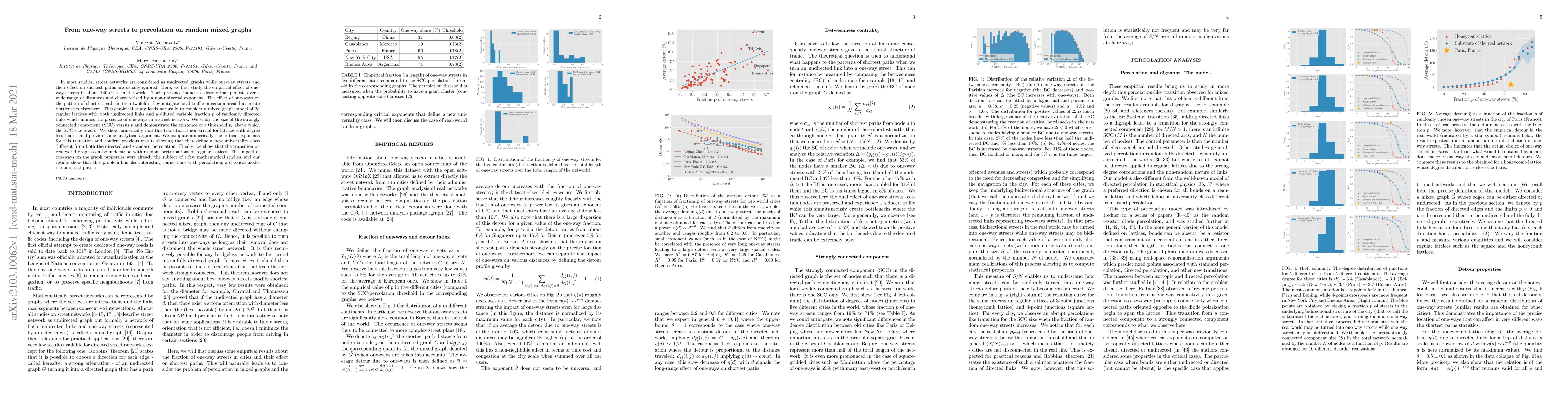 In most studies, street networks are considered as undirected graphs while one-way streets and their effect on shortest paths are usually ignored. Here, we first study the empirical effect of one-way streets in about $140$ cities in the world. Their presence induces a detour that persists over a wide range of distances and characterized by a non-universal exponent. The effect of one-ways on the pattern of shortest paths is then twofold: they mitigate local traffic in certain areas but create bottlenecks elsewhere. This empirical study leads naturally to consider a mixed graph model of 2d regular lattices with both undirected links and a diluted variable fraction $p$ of randomly directed links which mimics the presence of one-ways in a street network. We study the size of the strongly connected component (SCC) versus $p$ and demonstrate the existence of a threshold $p_c$ above which the SCC size is zero. We show numerically that this transition is non-trivial for lattices with degree less than $4$ and provide some analytical argument. We compute numerically the critical exponents for this transition and confirm previous results showing that they define a new universality class different from both the directed and standard percolation. Finally, we show that the transition on real-world graphs can be understood with random perturbations of regular lattices. The impact of one-ways on the graph properties were already the subject of a few mathematical studies, and our results show that this problem has also interesting connections with percolation, a classical model in statistical physics.