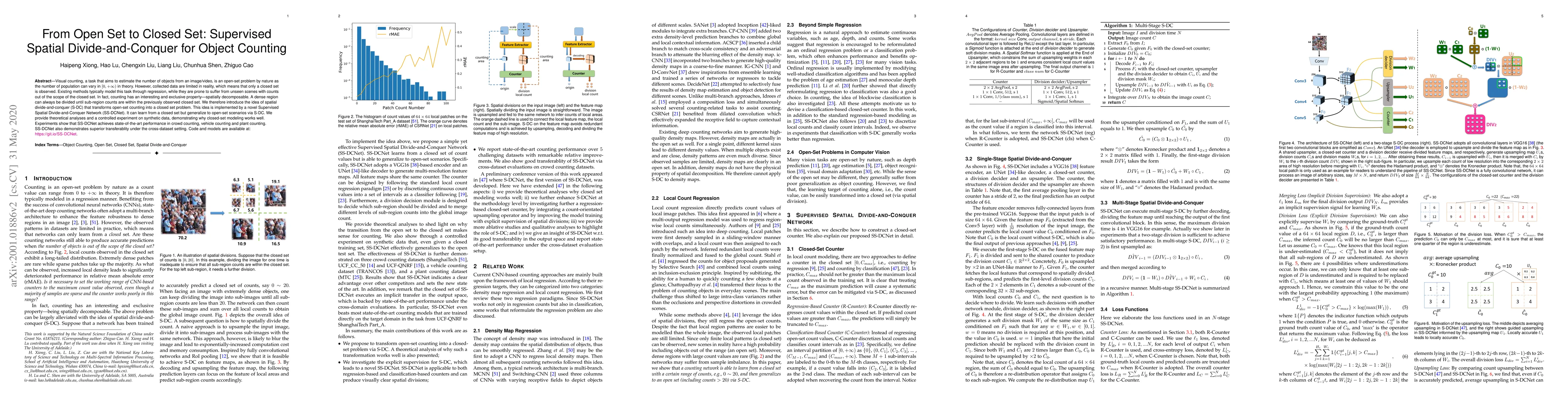 This paper proposes a Supervised Spatial Divide-and-Conquer Network (SS-DCNet) to address the open-set nature of visual counting by transforming it into a closed-set problem through spatial decomposition. SS-DCNet efficiently divides dense regions into sub-regions, ensuring counts remain within observed limits, achieving state-of-the-art performance.