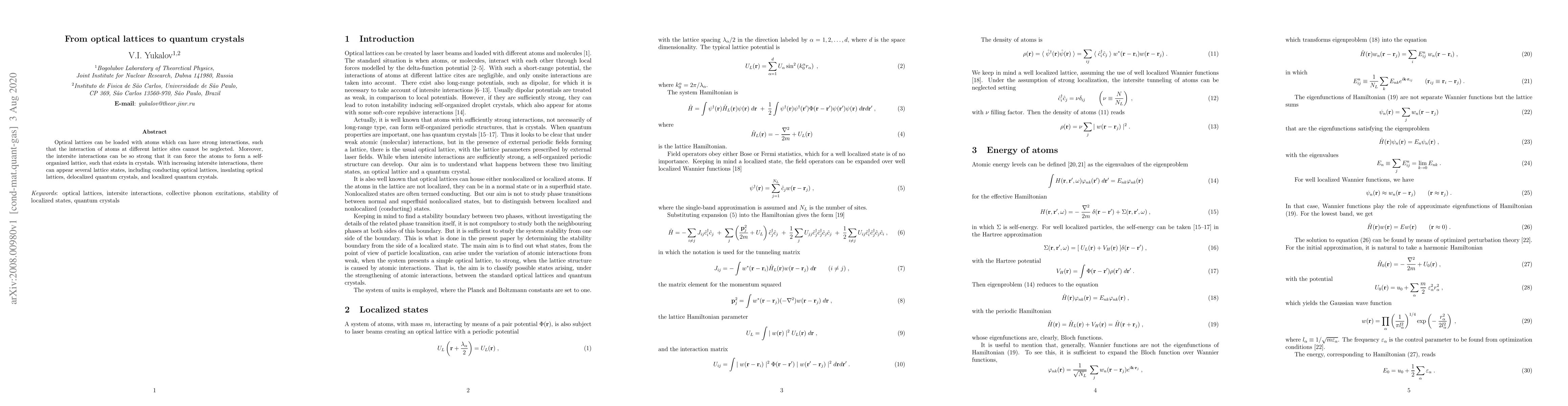 This paper explores the formation of quantum crystals from optical lattices, where strong intersite atomic interactions lead to self-organized lattice structures akin to those found in traditional crystals, including various states such as conducting and insulating optical lattices, and localized or delocalized quantum crystals.