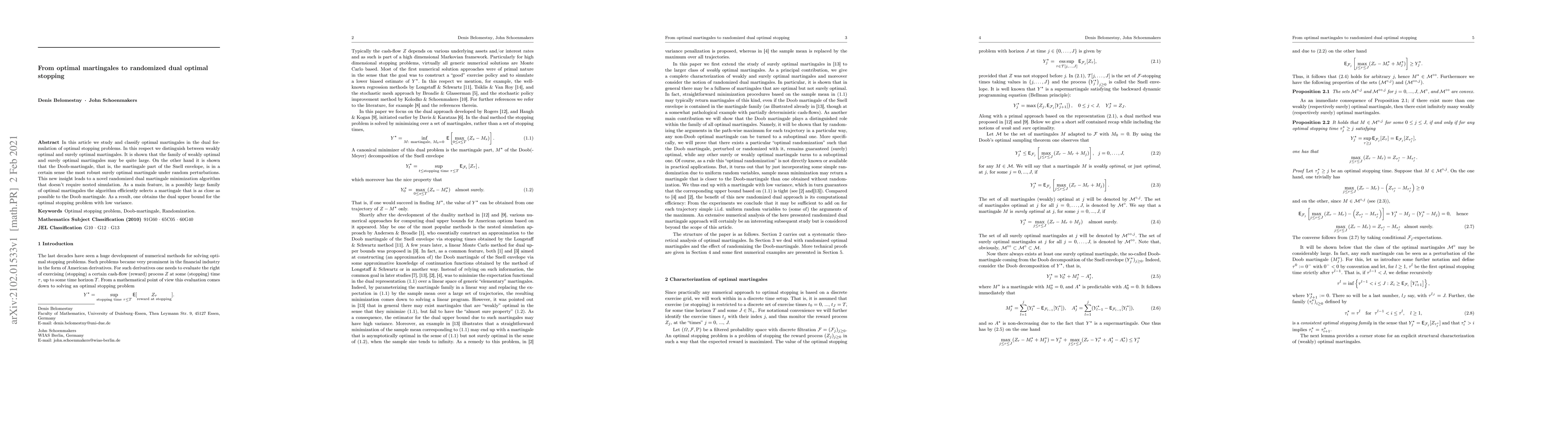 This paper classifies optimal martingales in dual optimal stopping problems, distinguishing between weakly optimal and surely optimal martingales. It introduces a novel randomized algorithm that efficiently selects a martingale close to the robust Doob martingale, achieving a low variance dual upper bound for optimal stopping problems without nested simulation.