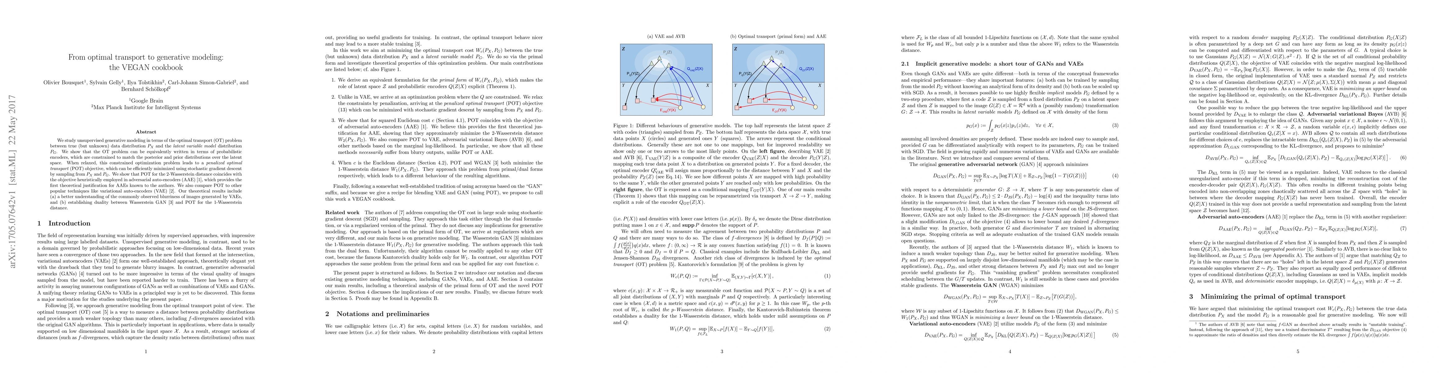 This paper explores the connection between optimal transport and generative modeling, showing that the optimal transport problem can be framed using probabilistic encoders. It introduces the penalized optimal transport (POT) objective, which aligns with the adversarial auto-encoders (AAE) approach, providing a theoretical justification for AAEs. The study also compares POT to variational auto-encoders, explaining the blurriness in VAE-generated images and establishing a duality between Wasserstein GAN and POT.