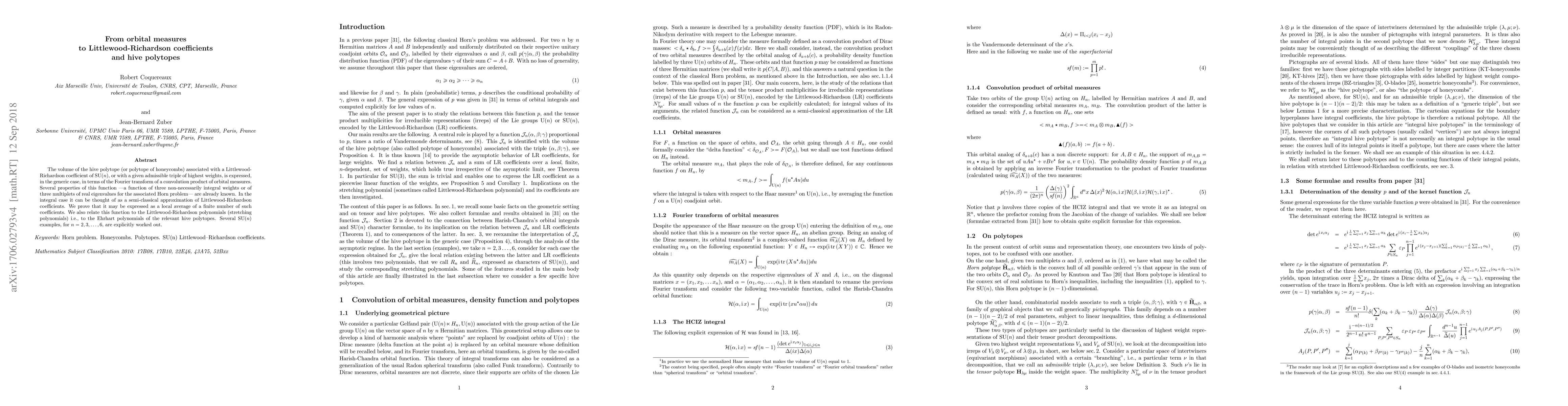 The volume of the hive polytope (or polytope of honeycombs) associated with a Littlewood- Richardson coefficient of SU(n), or with a given admissible triple of highest weights, is expressed, in the generic case, in terms of the Fourier transform of a convolution product of orbital measures. Several properties of this function -- a function of three non-necessarily integral weights or of three multiplets of real eigenvalues for the associated Horn problem-- are already known. In the integral case it can be thought of as a semi-classical approximation of Littlewood-Richardson coefficients. We prove that it may be expressed as a local average of a finite number of such coefficients. We also relate this function to the Littlewood-Richardson polynomials (stretching polynomials) i.e., to the Ehrhart polynomials of the relevant hive polytopes. Several SU(n) examples, for n=2,3,...,6, are explicitly worked out.