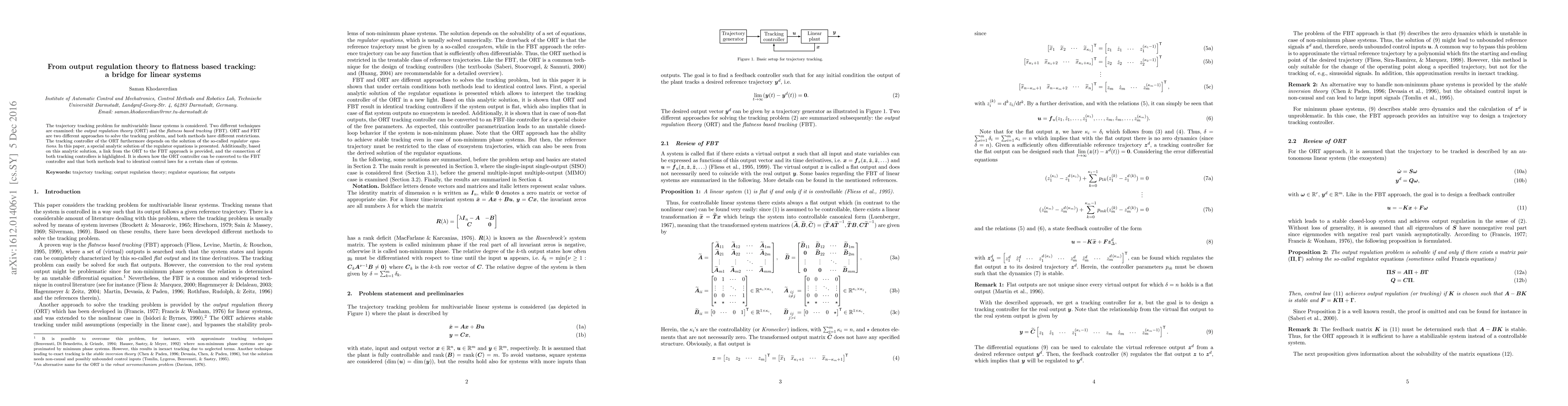 The trajectory tracking problem for multivariable linear systems is considered. Two different techniques are examined: the output regulation theory (ORT) and the flatness based tracking (FBT). ORT and FBT are two different approaches to solve the tracking problem, and both methods have different restrictions. The tracking controller of the ORT furthermore depends on the solution of the so-called regulator equations. In this paper, a special analytic solution of the regulator equations is presented. Additionally, based on this analytic solution, a link from the ORT to the FBT approach is provided, and the connection of both tracking controllers is highlighted. It is shown how the ORT controller can be converted to the FBT controller and that both methods lead to identical control laws for a certain class of systems.