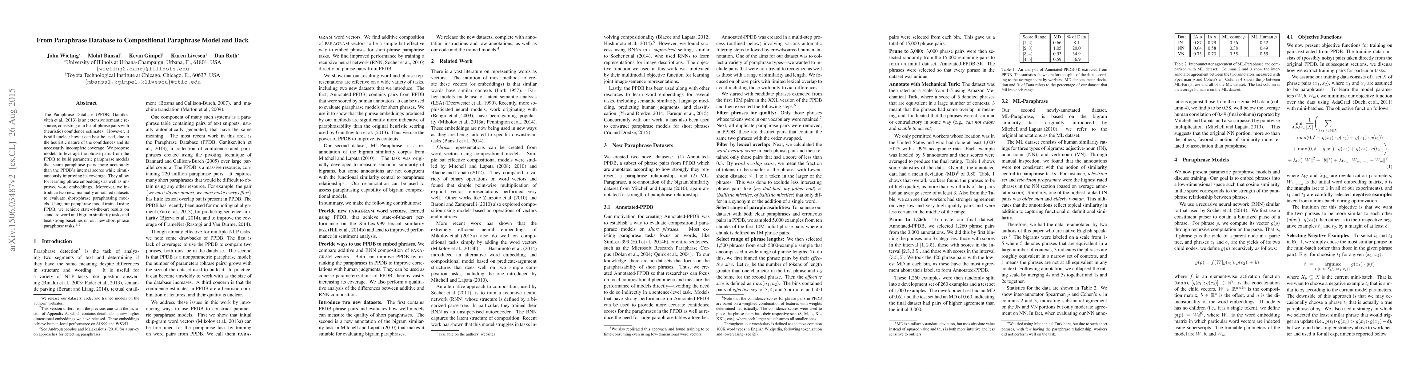 This paper proposes models to enhance the Paraphrase Database (PPDB) by leveraging its phrase pairs to build more accurate and comprehensive paraphrase models. The new models achieve state-of-the-art results on word and bigram similarity tasks and outperform baselines on newly annotated short phrase paraphrase datasets.