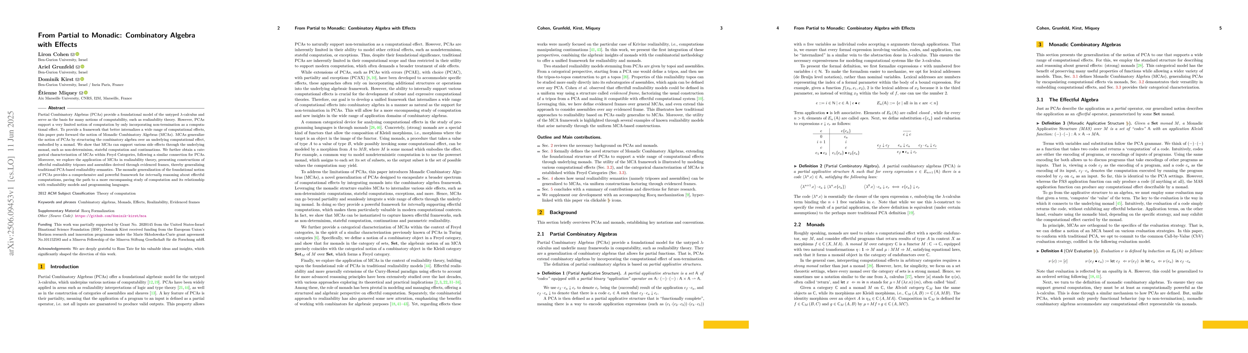 Partial Combinatory Algebras (PCAs) provide a foundational model of the untyped $\lambda$-calculus and serve as the basis for many notions of computability, such as realizability theory. However, PCAs support a very limited notion of computation by only incorporating non-termination as a computational effect. To provide a framework that better internalizes a wide range of computational effects, this paper puts forward the notion of Monadic Combinatory Algebras (MCAs). MCAs generalize the notion of PCAs by structuring the combinatory algebra over an underlying computational effect, embodied by a monad. We show that MCAs can support various side effects through the underlying monad, such as non-determinism, stateful computation and continuations. We further obtain a categorical characterization of MCAs within Freyd Categories, following a similar connection for PCAs. Moreover, we explore the application of MCAs in realizability theory, presenting constructions of effectful realizability triposes and assemblies derived through evidenced frames, thereby generalizing traditional PCA-based realizability semantics. The monadic generalization of the foundational notion of PCAs provides a comprehensive and powerful framework for internally reasoning about effectful computations, paving the path to a more encompassing study of computation and its relationship with realizability models and programming languages.