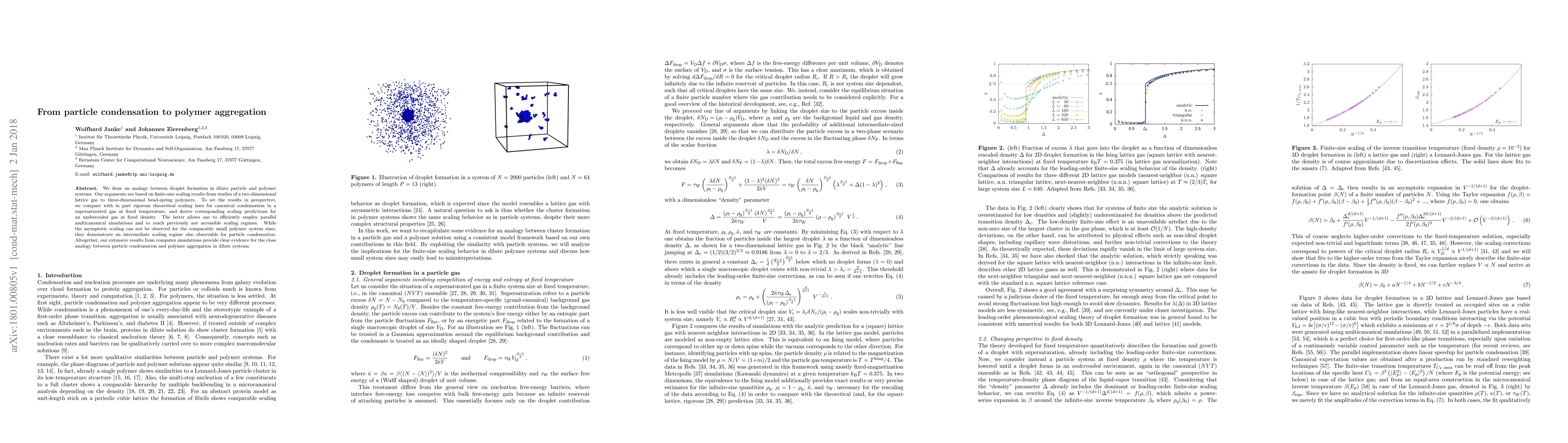 Researchers found a close analogy between particle condensation and polymer aggregation in dilute systems through computer simulations, revealing intermediate scaling regimes for both phenomena.