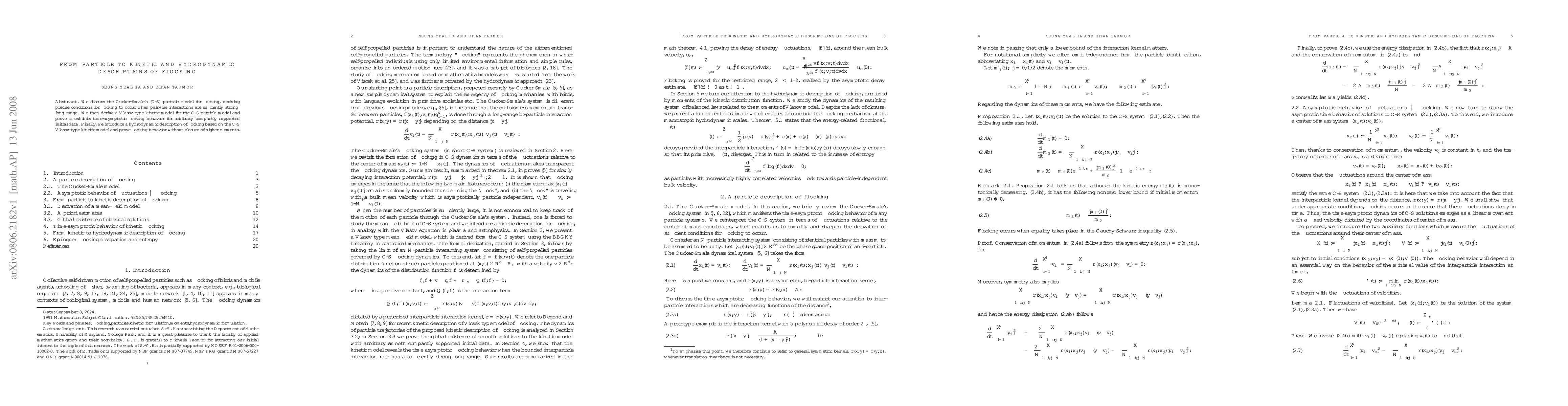 We discuss the Cucker-Smale's (C-S) particle model for flocking, deriving precise conditions for flocking to occur when pairwise interactions are sufficiently strong long range. We then derive a Vlasov-type kinetic model for the C-S particle model and prove it exhibits time-asymptotic flocking behavior for arbitrary compactly supported initial data. Finally, we introduce a hydrodynamic description of flocking based on the C-S Vlasov-type kinetic model and prove flocking behavior \emph{without} closure of higher moments.