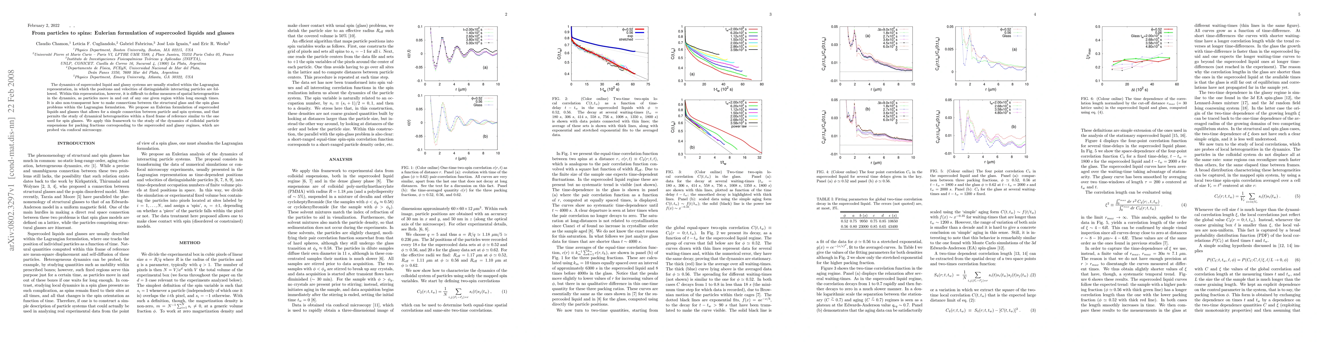 The dynamics of supercooled liquid and glassy systems are usually studied within the Lagrangian representation, in which the positions and velocities of distinguishable interacting particles are followed. Within this representation, however, it is difficult to define measures of spatial heterogeneities in the dynamics, as particles move in and out of any one given region within long enough times. It is also non-transparent how to make connections between the structural glass and the spin glass problems within the Lagrangian formulation. We propose an Eulerian formulation of supercooled liquids and glasses that allows for a simple connection between particle and spin systems, and that permits the study of dynamical heterogeneities within a fixed frame of reference similar to the one used for spin glasses. We apply this framework to the study of the dynamics of colloidal particle suspensions for packing fractions corresponding to the supercooled and glassy regimes, which are probed via confocal microscopy.