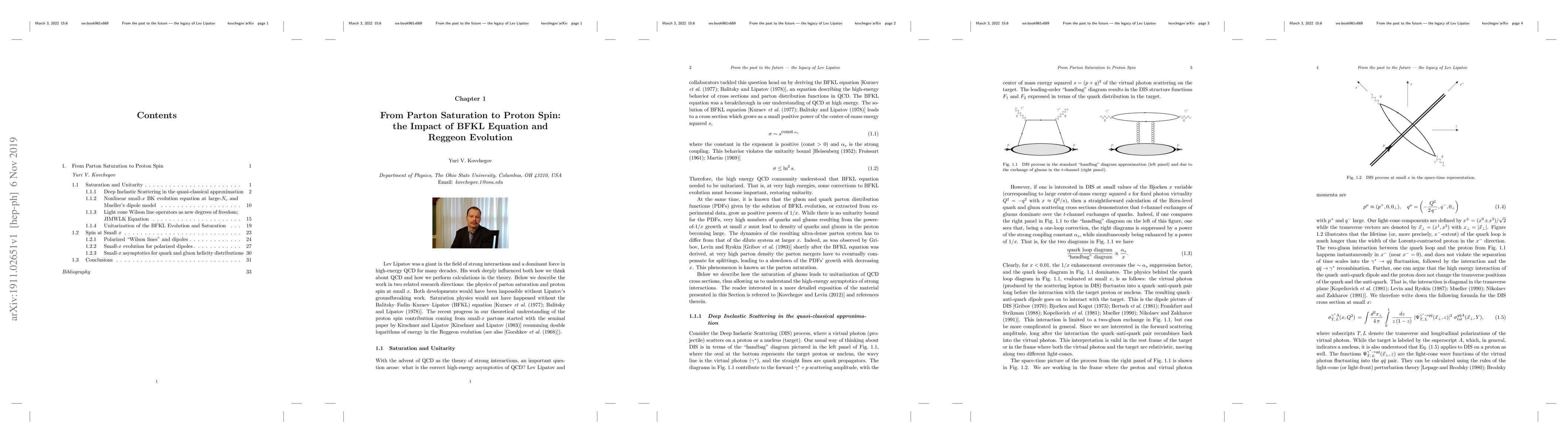 Lev Lipatov was a giant in the field of strong interactions and a dominant force in high-energy QCD for many decades. His work deeply influenced both how we think about QCD and how we perform calculations in the theory. Below we describe the work in two related research directions: the physics of parton saturation and proton spin at small $x$. Both developments would have been impossible without Lipatov's groundbreaking work. Saturation physics would not have happened without the Balitsky-Fadin-Kuraev-Lipatov (BFKL) equation. The recent progress in our theoretical understanding of the proton spin contribution coming from small-$x$ partons started with the seminal paper by Kirschner and Lipatov resumming double logarithms of energy in the Reggeon evolution.