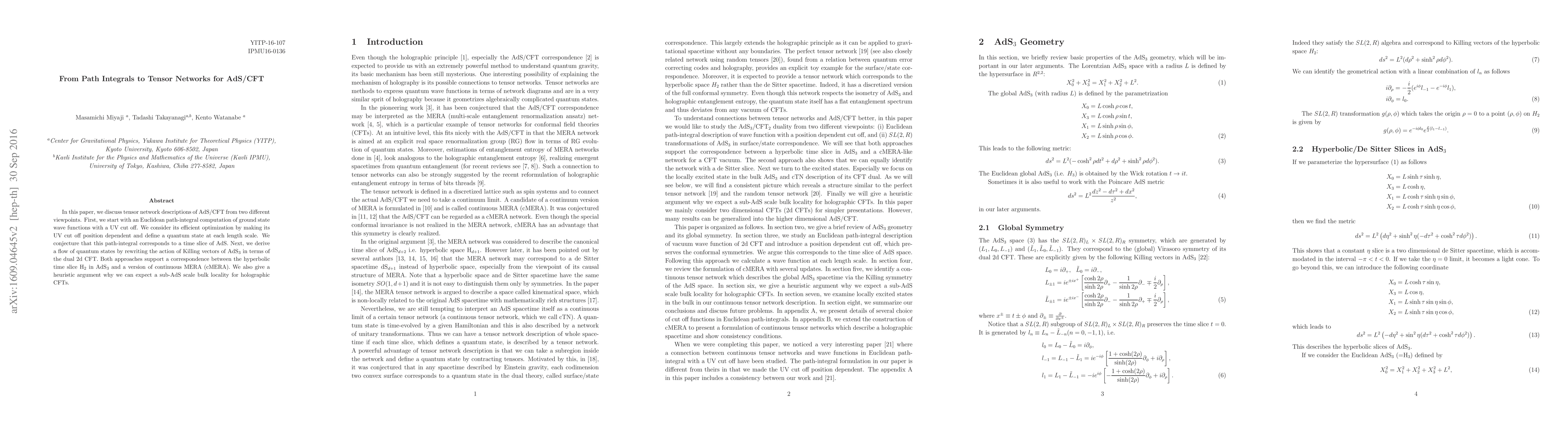 This paper explores tensor network descriptions of AdS/CFT, linking Euclidean path integrals with dependent UV cutoffs to tensor networks, and deriving a flow of quantum states via Killing vectors, supporting a correspondence between AdS3's hyperbolic time slice and continuous MERA. It also argues for sub-AdS scale bulk locality in holographic CFTs.