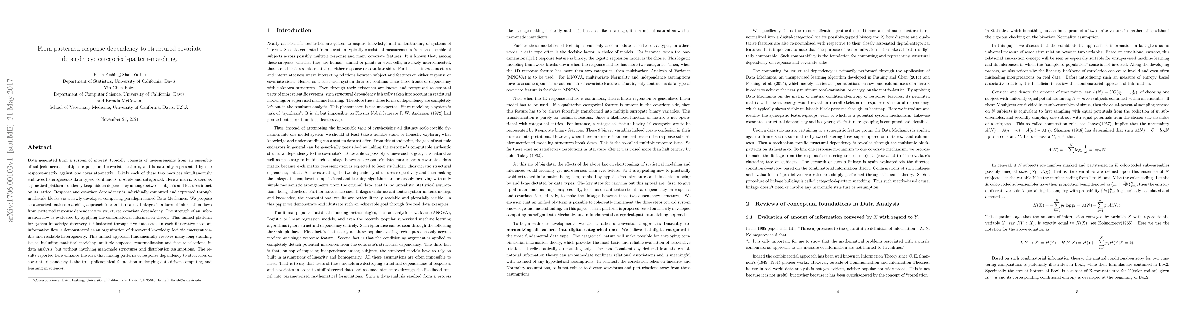Data generated from a system of interest typically consists of measurements from an ensemble of subjects across multiple response and covariate features, and is naturally represented by one response-matrix against one covariate-matrix. Likely each of these two matrices simultaneously embraces heterogeneous data types: continuous, discrete and categorical. Here a matrix is used as a practical platform to ideally keep hidden dependency among/between subjects and features intact on its lattice. Response and covariate dependency is individually computed and expressed through mutliscale blocks via a newly developed computing paradigm named Data Mechanics. We propose a categorical pattern matching approach to establish causal linkages in a form of information flows from patterned response dependency to structured covariate dependency. The strength of an information flow is evaluated by applying the combinatorial information theory. This unified platform for system knowledge discovery is illustrated through five data sets. In each illustrative case, an information flow is demonstrated as an organization of discovered knowledge loci via emergent visible and readable heterogeneity. This unified approach fundamentally resolves many long standing issues, including statistical modeling, multiple response, renormalization and feature selections, in data analysis, but without involving man-made structures and distribution assumptions. The results reported here enhance the idea that linking patterns of response dependency to structures of covariate dependency is the true philosophical foundation underlying data-driven computing and learning in sciences.