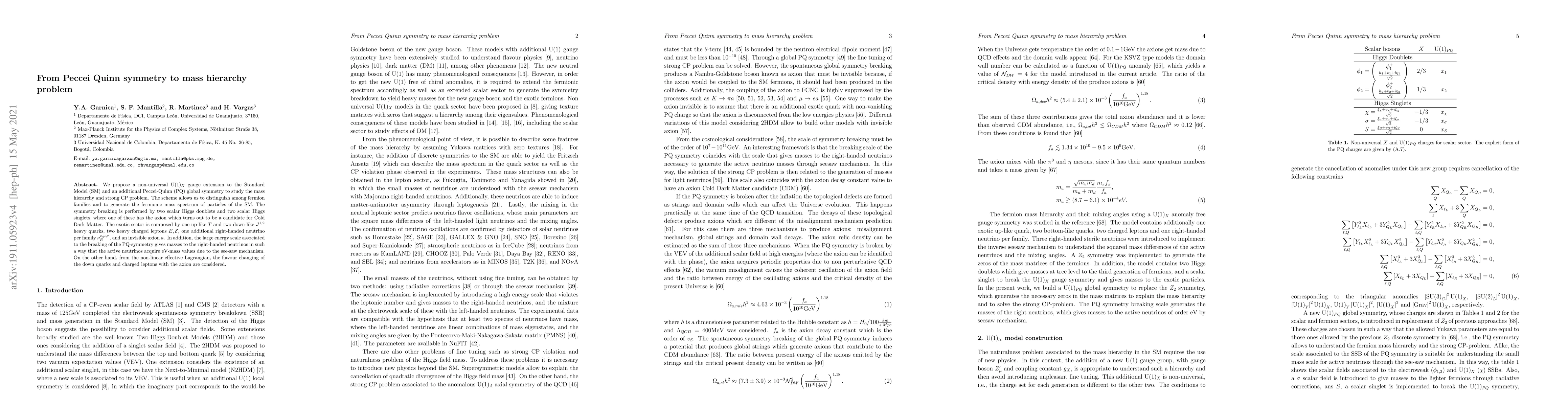 This research proposes a new gauge extension to the Standard Model incorporating Peccei-Quinn symmetry, distinguishing fermion families and addressing mass hierarchy and strong CP problems. It introduces new heavy quarks, leptons, and neutrinos, with an axion as a Cold Dark Matter candidate, also explaining active neutrino masses via the see-saw mechanism.